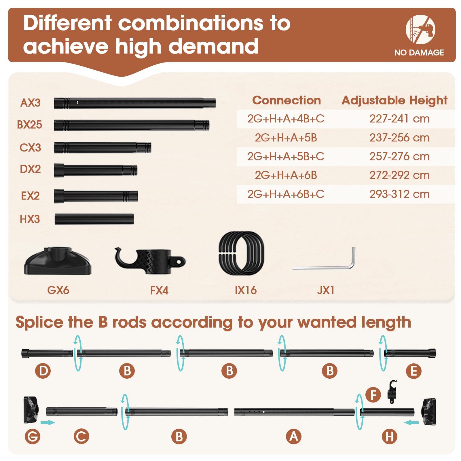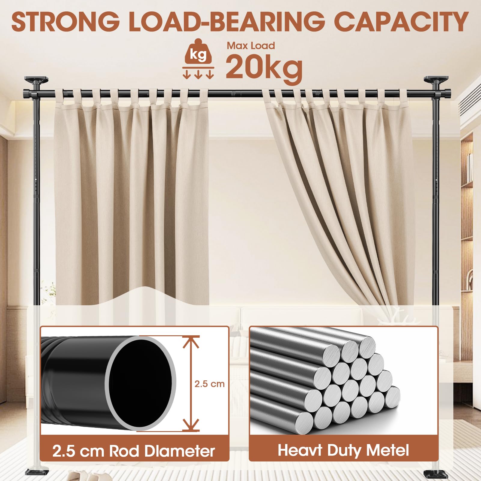 - Flexible Abmessungen: Die Höhe lässt sich stufenlos von 227 cm bis 312 cm justieren, während die Breite von 71 cm bis 290 cm angepasst werden kann. Mit den mitgelieferten Verlängerungsstangen finden Sie für jeden Raum die passende Grösse.