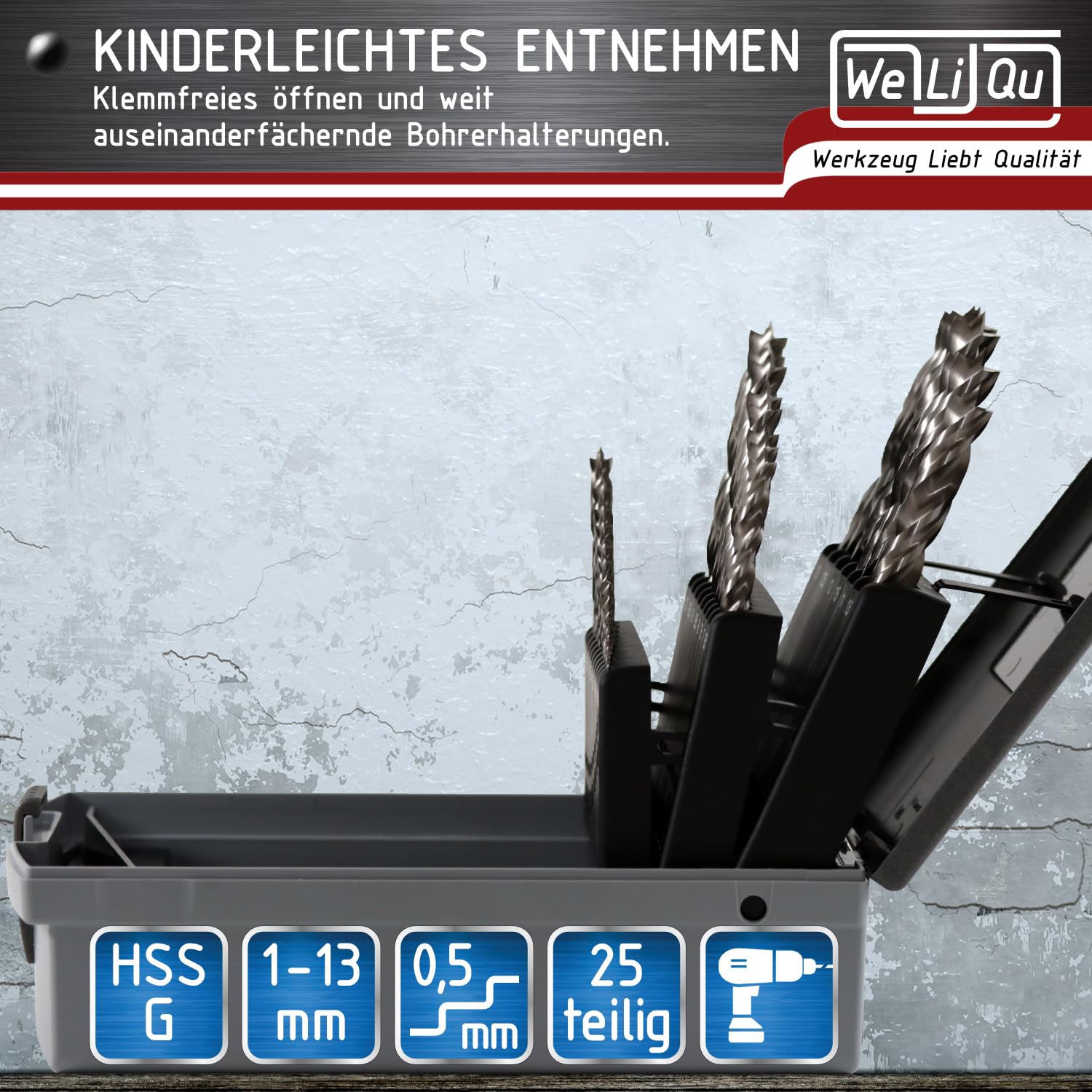 Das Set beinhaltet 25 Bohrer in feinen 0,5 mm Schritten, die den gesamten Grössenbereich von 1 mm bis 13 mm abdecken. Die Bohrer sind universell einsetzbar und mit allen handelsüblichen Bohrmaschinen und Akkuschraubern kompatibel.