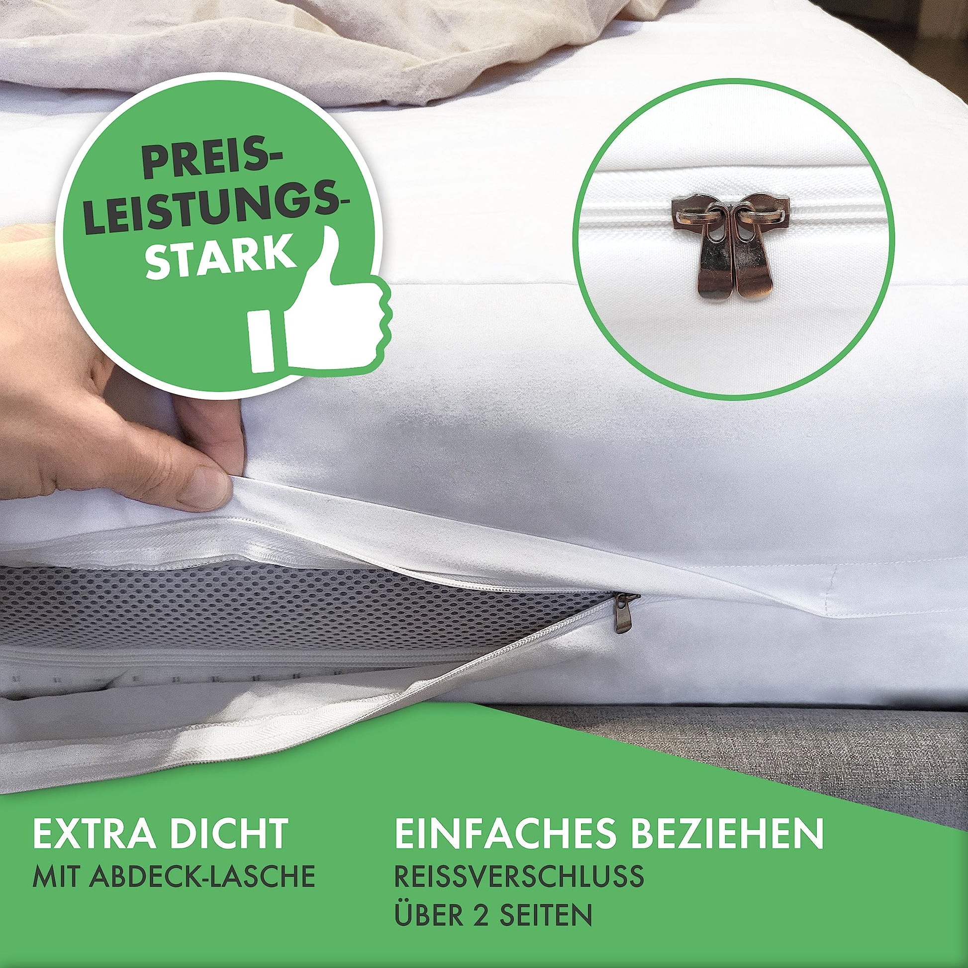 Der Bezug funktioniert als 360-Grad-Encasing, das Ihre Matratze (bis 20 cm Höhe) komplett umschliesst. Sein extrem dichtes Mikrofasergewebe bildet eine rein physikalische, undurchdringbare Barriere, die Milben, Bettwanzen und deren Allergene zuverlässig einschliesst und fernhält.