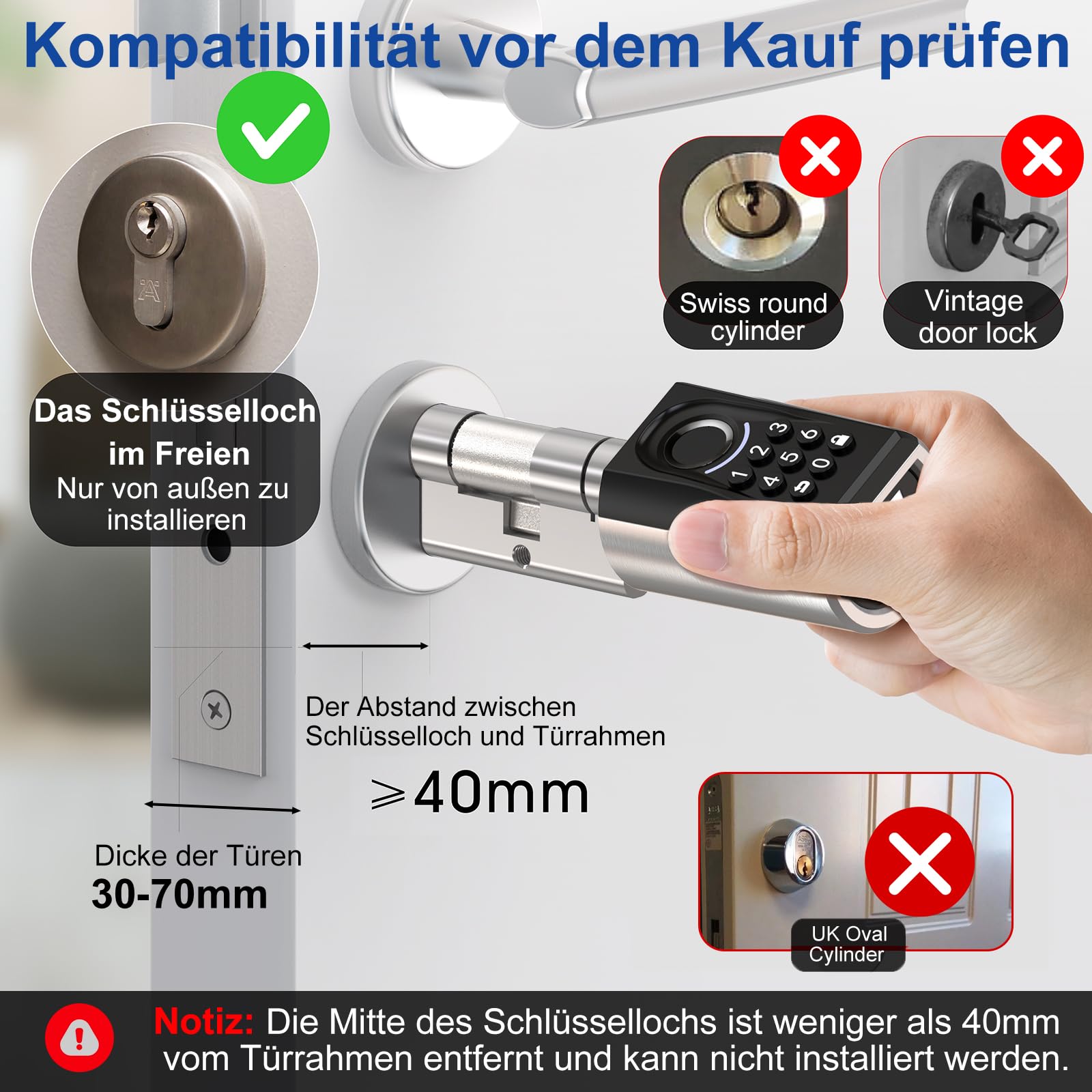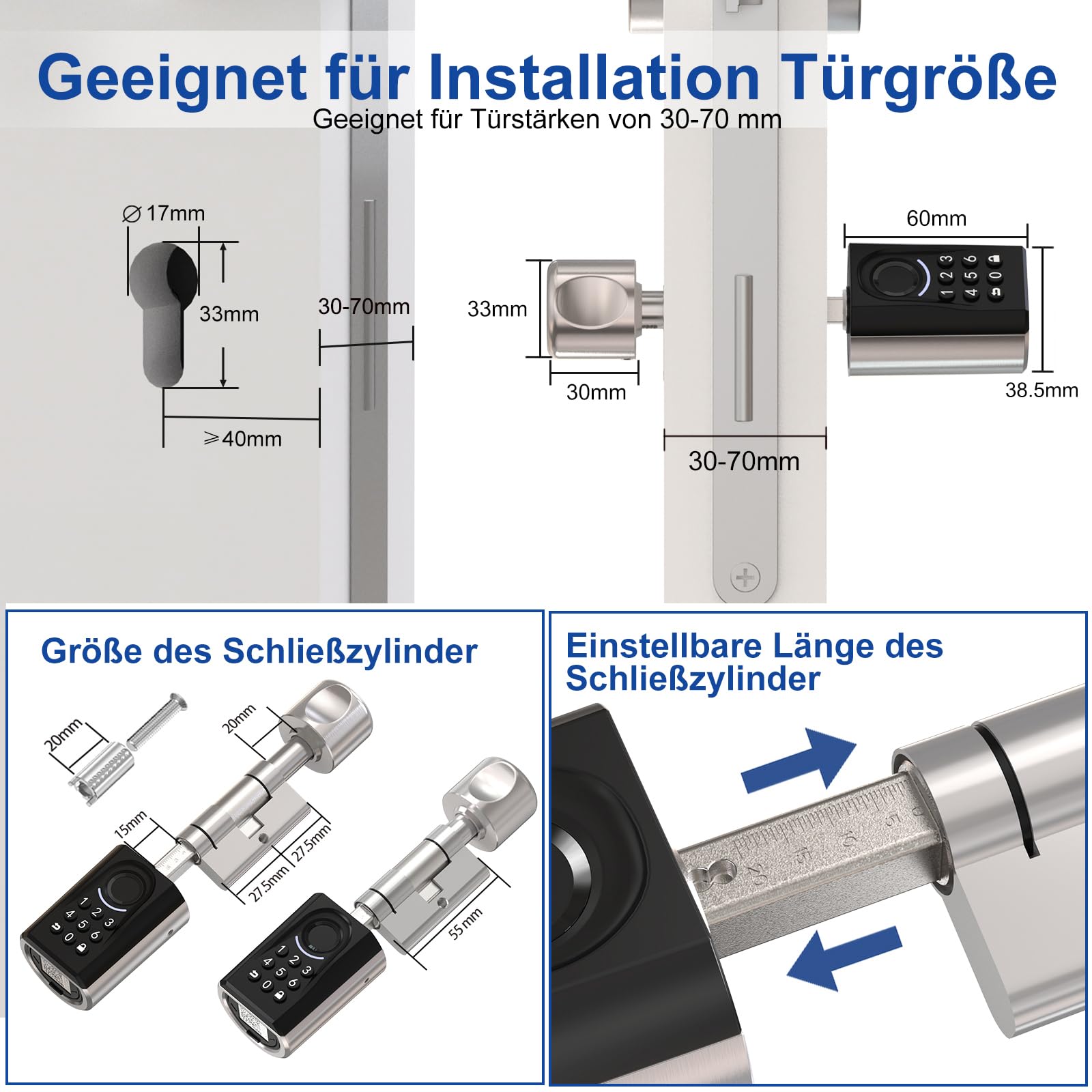 - Kompatibilität: Geeignet für alle Türen mit einer Dicke von 30 mm bis 70 mm.