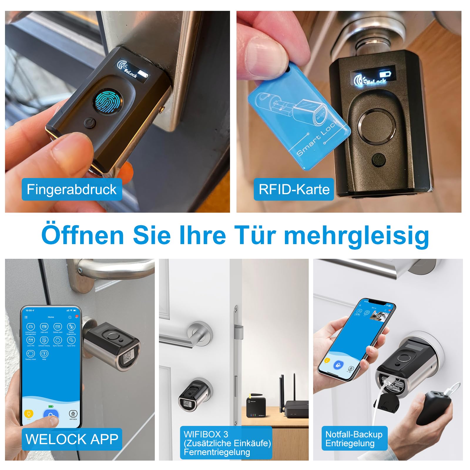 - 5-in-1-Zutrittsmöglichkeiten: Öffnen Sie Ihre Tür bequem per Fingerabdruck, mit einer von 20 autorisierten RFID-Karten, über die WELOCK App oder mittels einer USB-Notentriegelung. Optional ist auch eine Fernentriegelung via Wi-Fi-Gateway möglich.