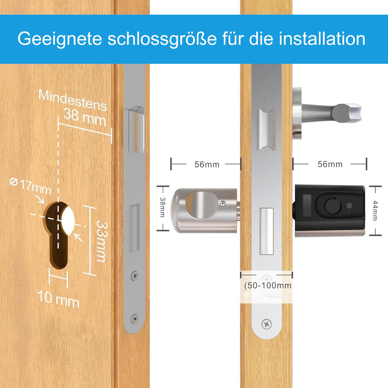 Nein, die Montage ist sehr einfach und dauert in der Regel weniger als 5 Minuten. Sie tauschen lediglich den bestehenden Europrofil-Zylinder ohne zu bohren aus. Dank des verstellbaren Zylinders passt das Schloss auf die meisten gängigen Türen mit einer Dicke von 50 mm bis 100 mm.