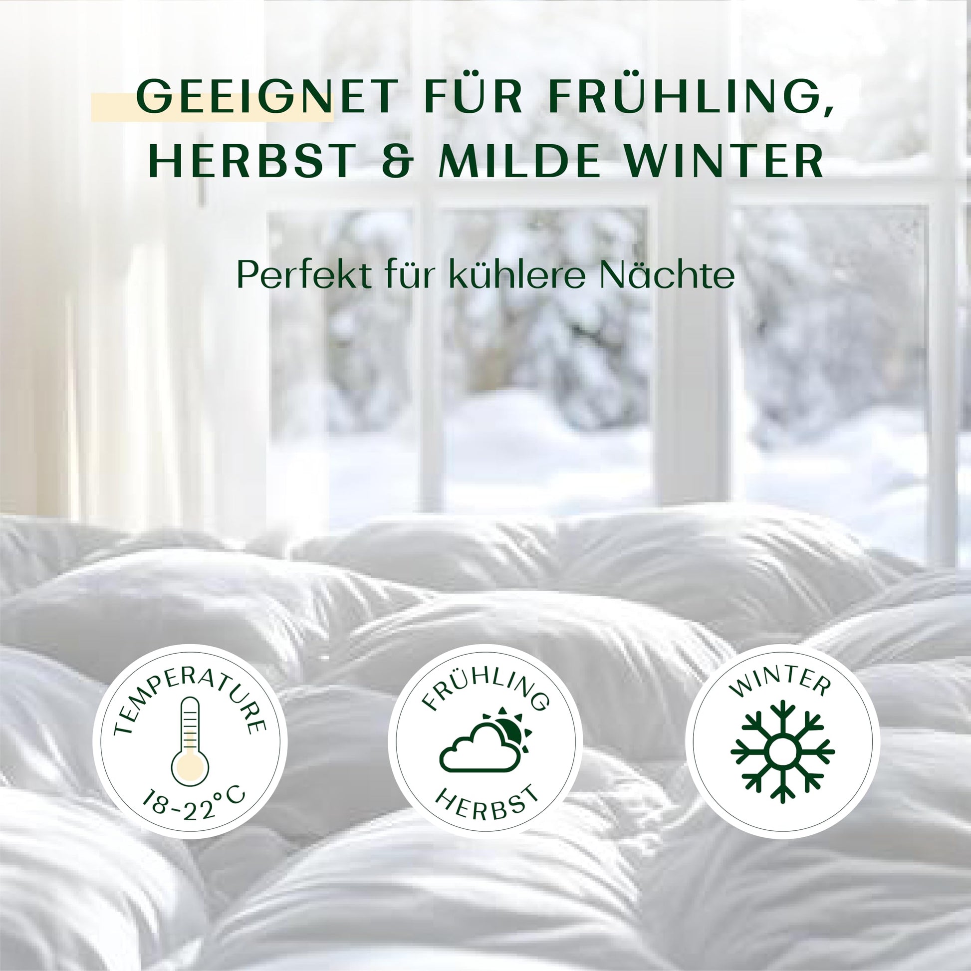 Diese Decke ist als Ganzjahresdecke konzipiert. Mit ihrer mittleren Wärmeklasse (300 GSM) spendet sie ideale Wärme im Frühling, Herbst und in milden Wintern, während sie dank ihrer Atmungsaktivität auch für kühlere Sommernächte geeignet ist. Sie ist die perfekte Ein-Decken-Lösung für das ganze Jahr.