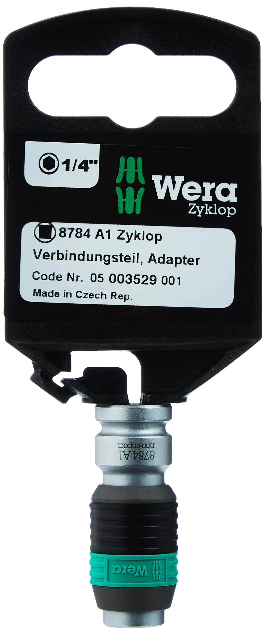 Der Schlüssel hat einen 1/4-Zoll-Vierkantantrieb für alle gängigen 1/4"-Stecknüsse. Zusätzlich liegt ein hochwertiger Zyklop-Adapter bei, der den Schlüssel mit einem Schnellwechselfutter für Standard 1/4"-Sechskant-Bits (passend für Wera Anschluss-Reihen 1 und 4) ausstattet.