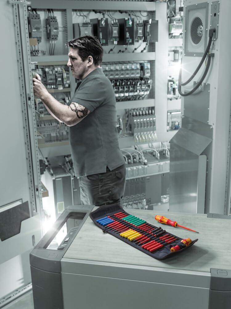 Das VDE-Set ist stückgeprüft gemäss IEC 60900. Jede einzelne Wechselklinge und jeder Handhalter wird bei 10'000 Volt getestet, um absolut sicheres Arbeiten an spannungsführenden Teilen bis 1'000 Volt zu garantieren.