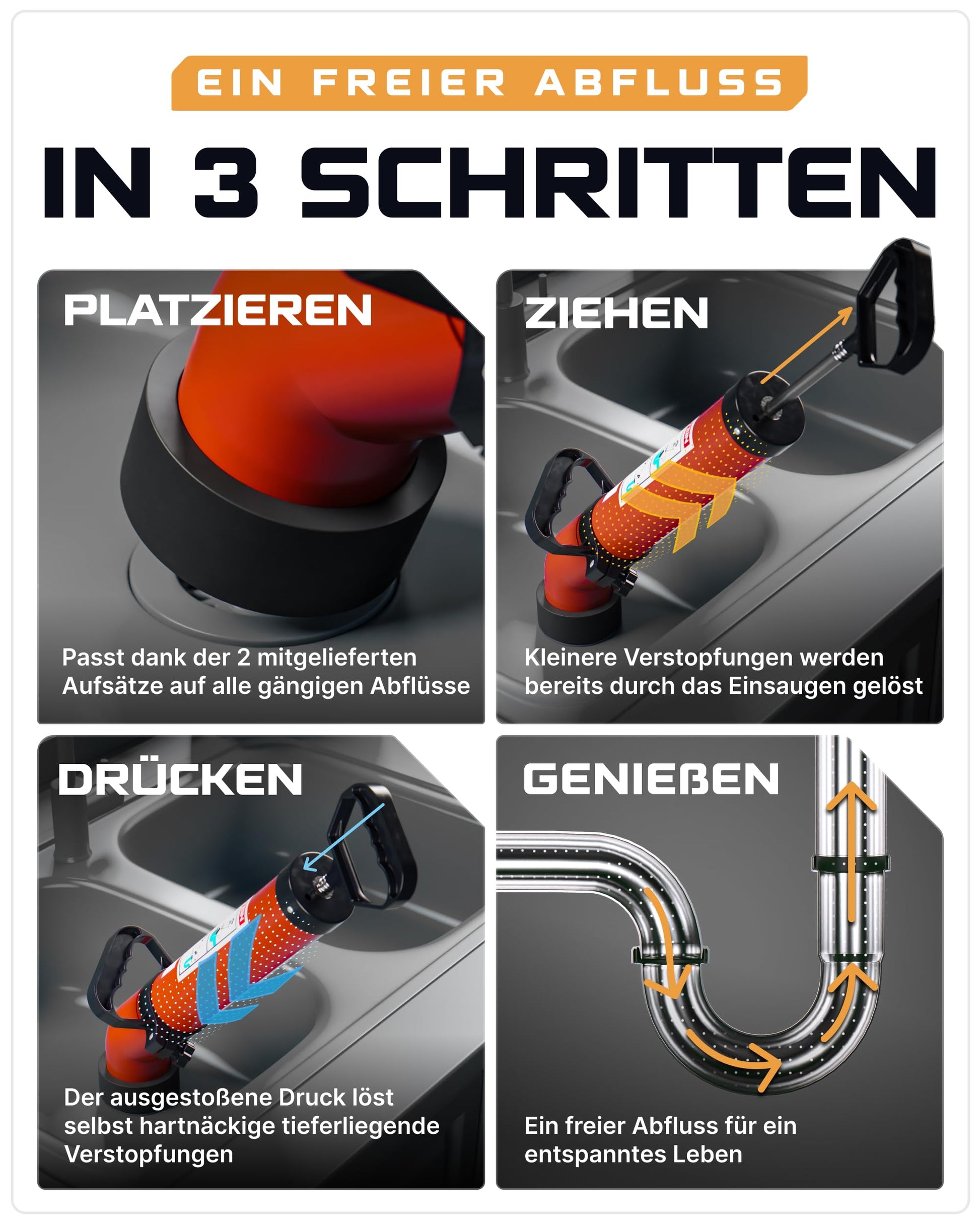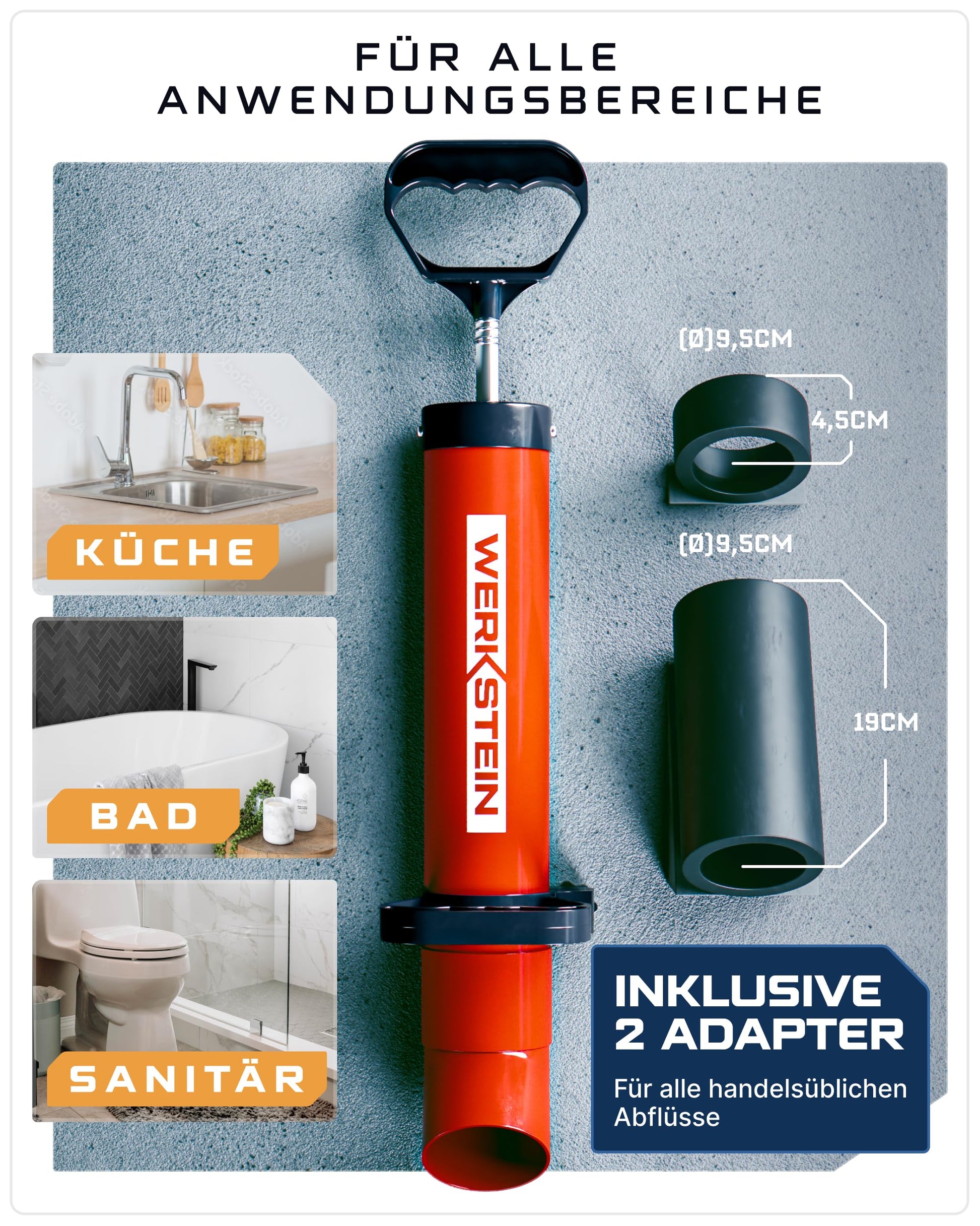 Diese Rohrreinigungspumpe ist die kraftvolle und umweltfreundliche Lösung für verstopfte Abflüsse. Befreien Sie Ihre Leitungen in Küche, Bad und WC schnell und zuverlässig, ganz ohne den Einsatz von Chemie.
