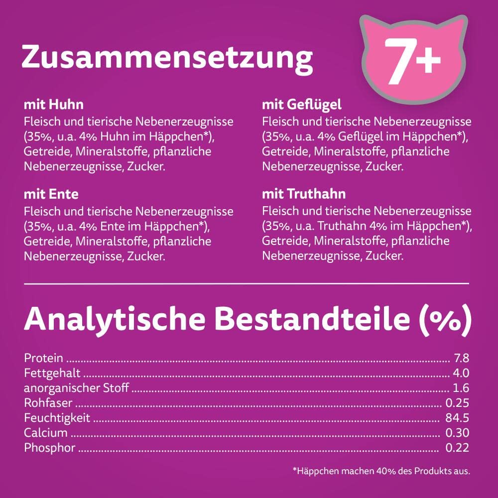 Dieses Futter ist speziell als vollwertige Mahlzeit für Katzen ab dem siebten Lebensjahr entwickelt worden, um deren spezifische Ernährungsbedürfnisse optimal zu decken.