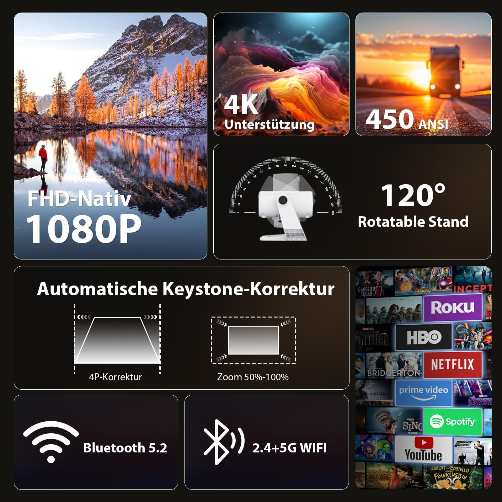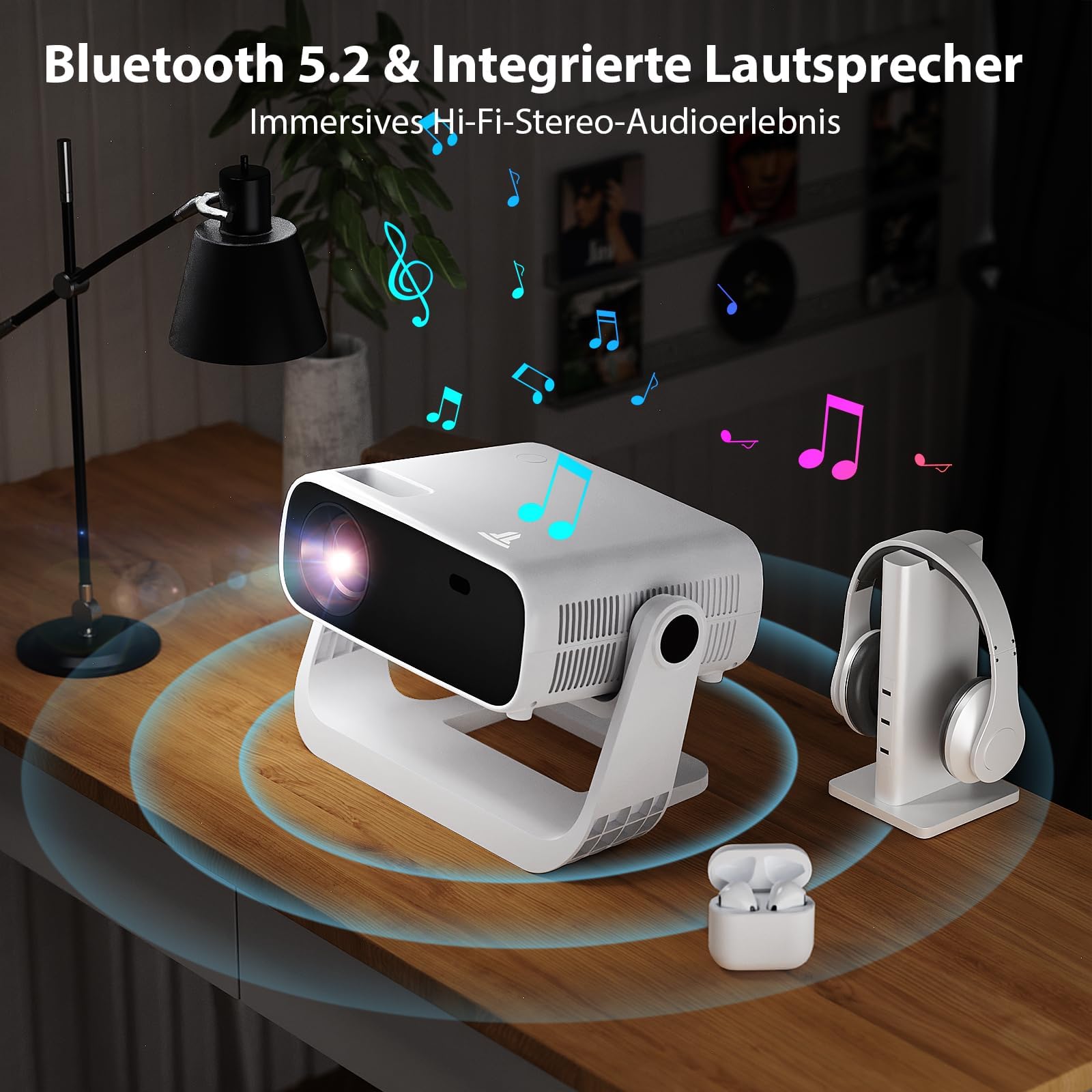 Der Beamer ist mit ultraschnellem WiFi 6 ausgestattet, das eine stabile und verzögerungsfreie Verbindung für flüssiges Streaming gewährleistet. Für den Ton können Sie externe Lautsprecher oder Kopfhörer ganz einfach und kabellos über das stabile Bluetooth 5.2 verbinden.