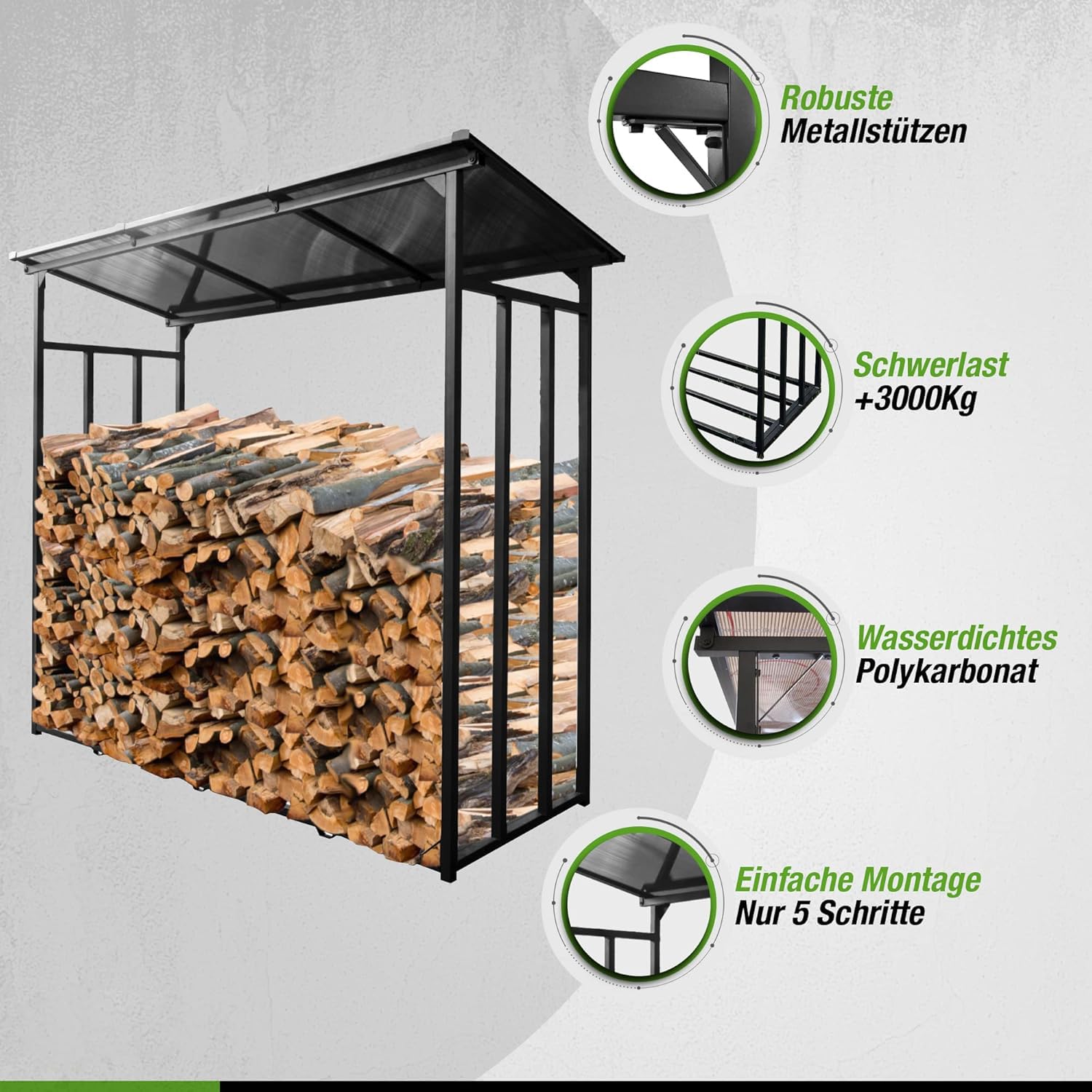 - XXL-Fassungsvermögen: Bietet mit einem Volumen von 2,3 m³ (entspricht 3,3 SRM) ausreichend Platz für einen grossen Vorrat von bis zu 3'000 kg Kaminholz.