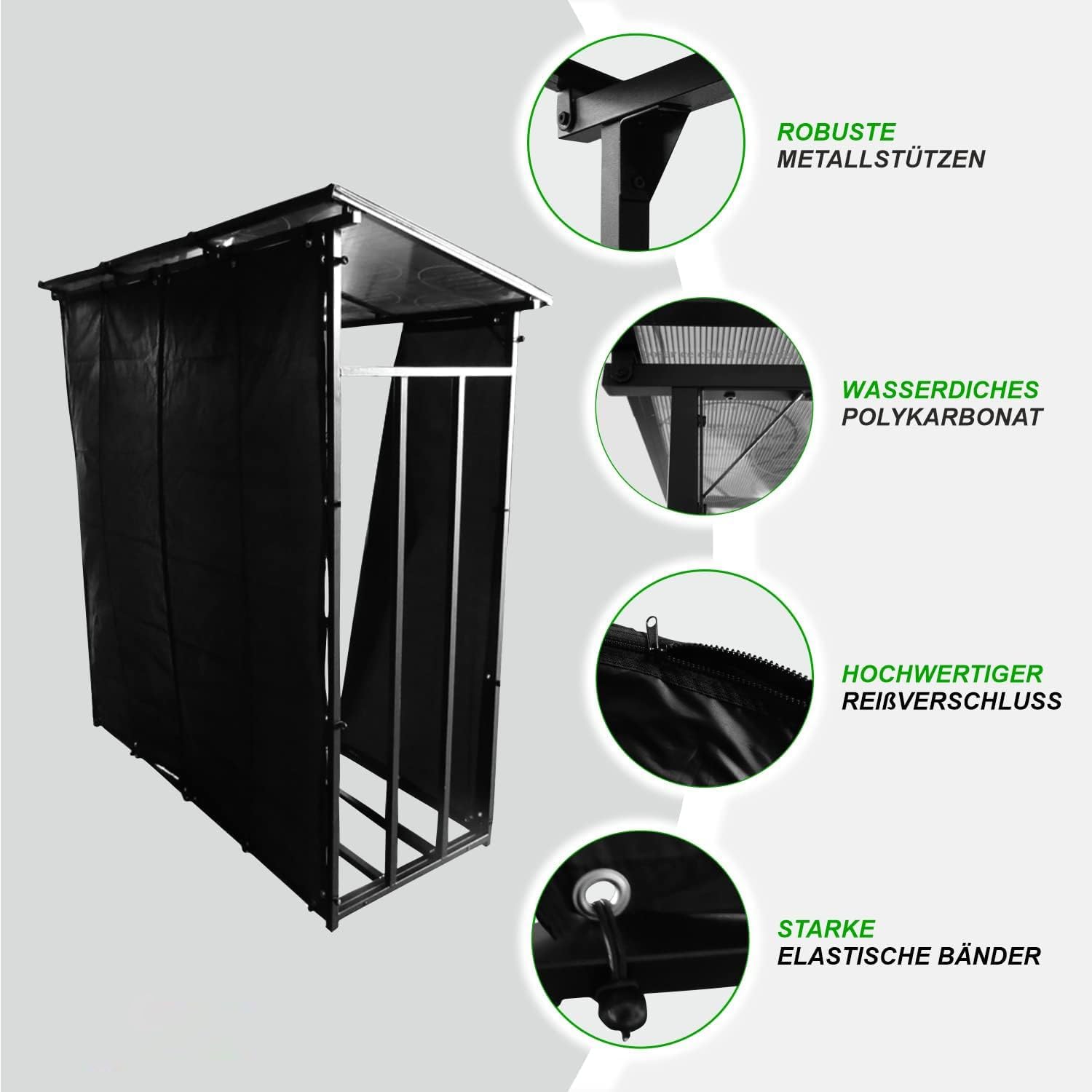 - Wetterfestes Dach: Das Pultdach aus Aluminiumprofilen und 6 mm starken Polycarbonat-Hohlkammerplatten schützt Ihr Holz zuverlässig vor Regen und Schnee.