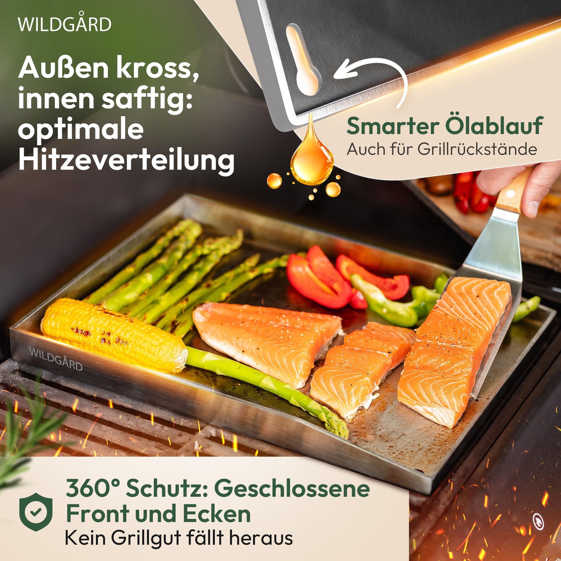 Ja, absolut. Die Plancha verfügt über vollständig verschweisste Kanten und Ecken. Dieses durchdachte Design verhindert zuverlässig, dass Fett, Öl oder Marinaden in Ihren Grill tropfen, was die spätere Reinigung des Grills erheblich erleichtert.