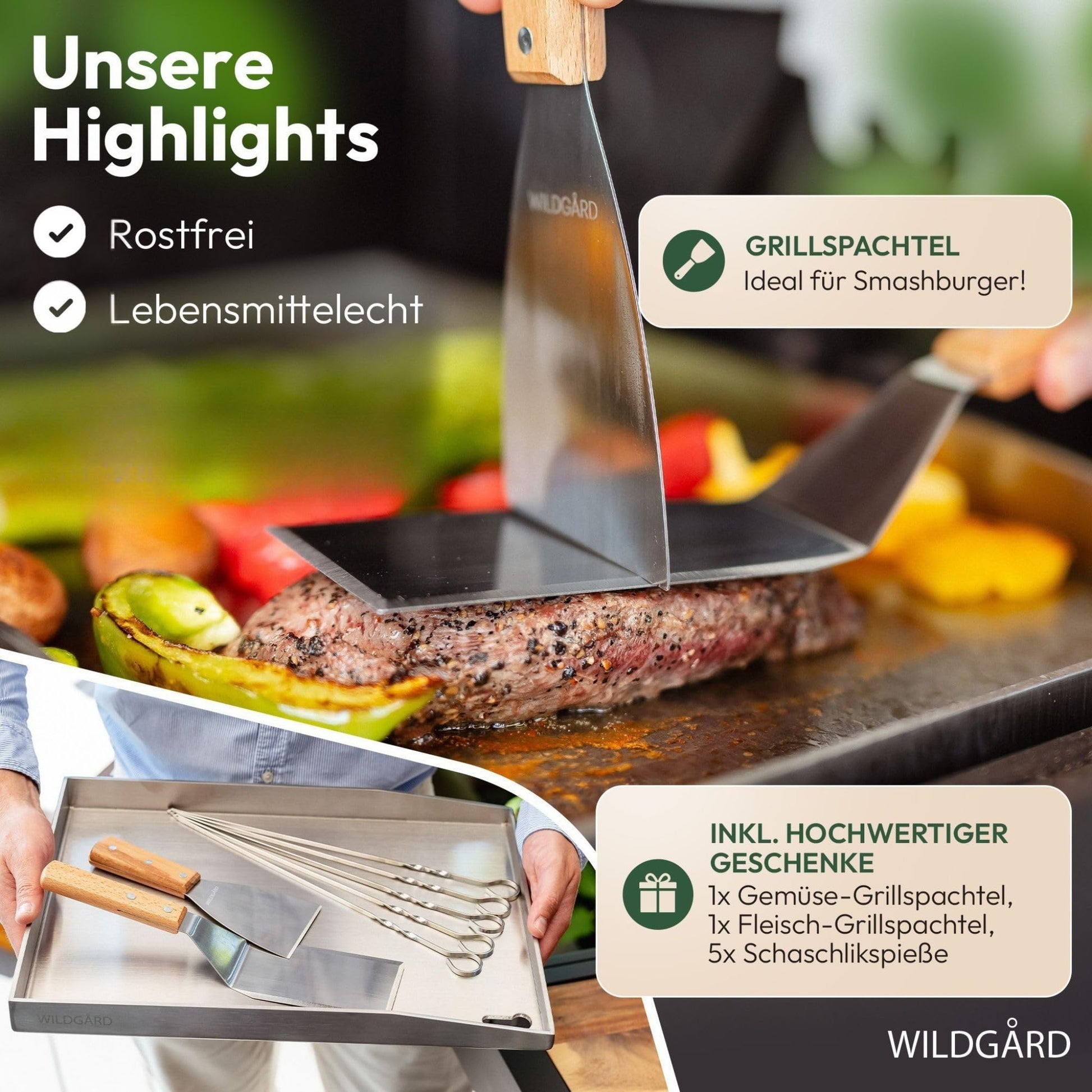 Das Set ist sofort einsatzbereit und enthält neben der 40 x 30 cm Edelstahl-Grillplatte auch zwei professionelle Grillspachtel und fünf robuste Edelstahlspiesse – alles, was Sie für ein vielseitiges Grillerlebnis benötigen.