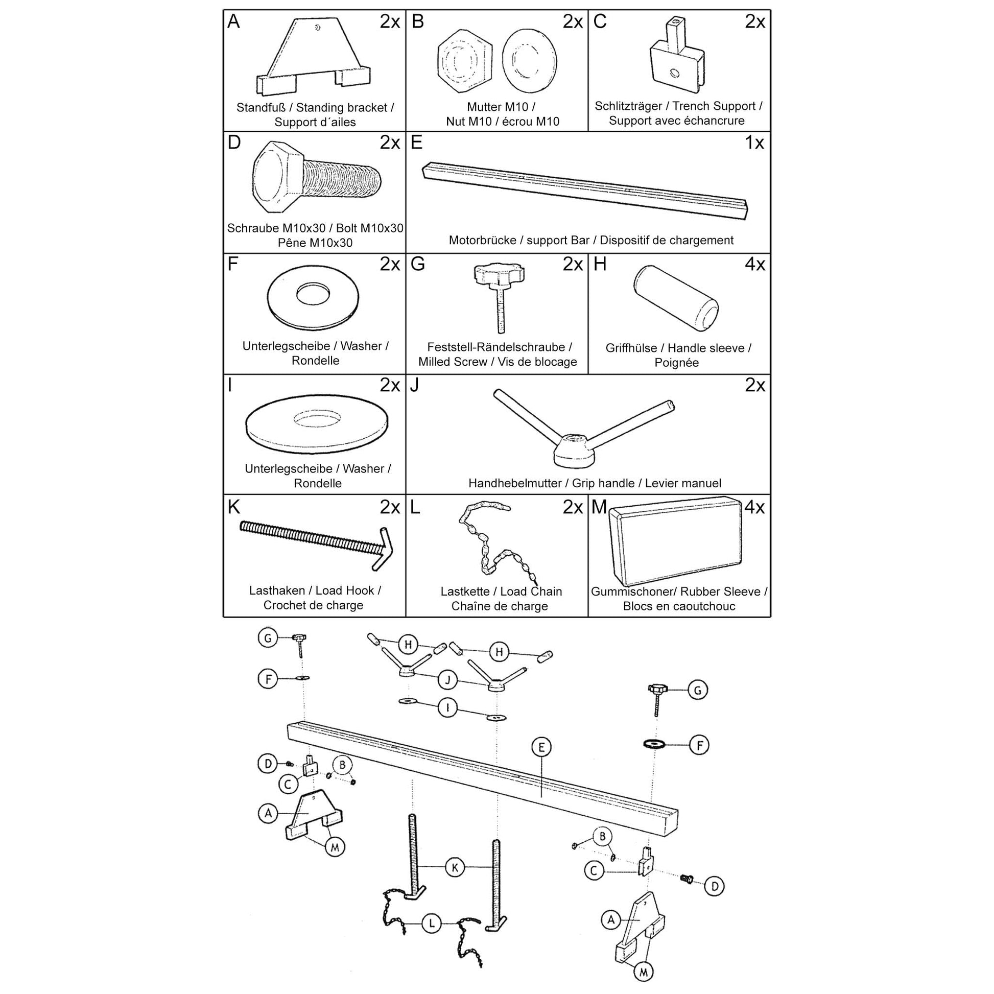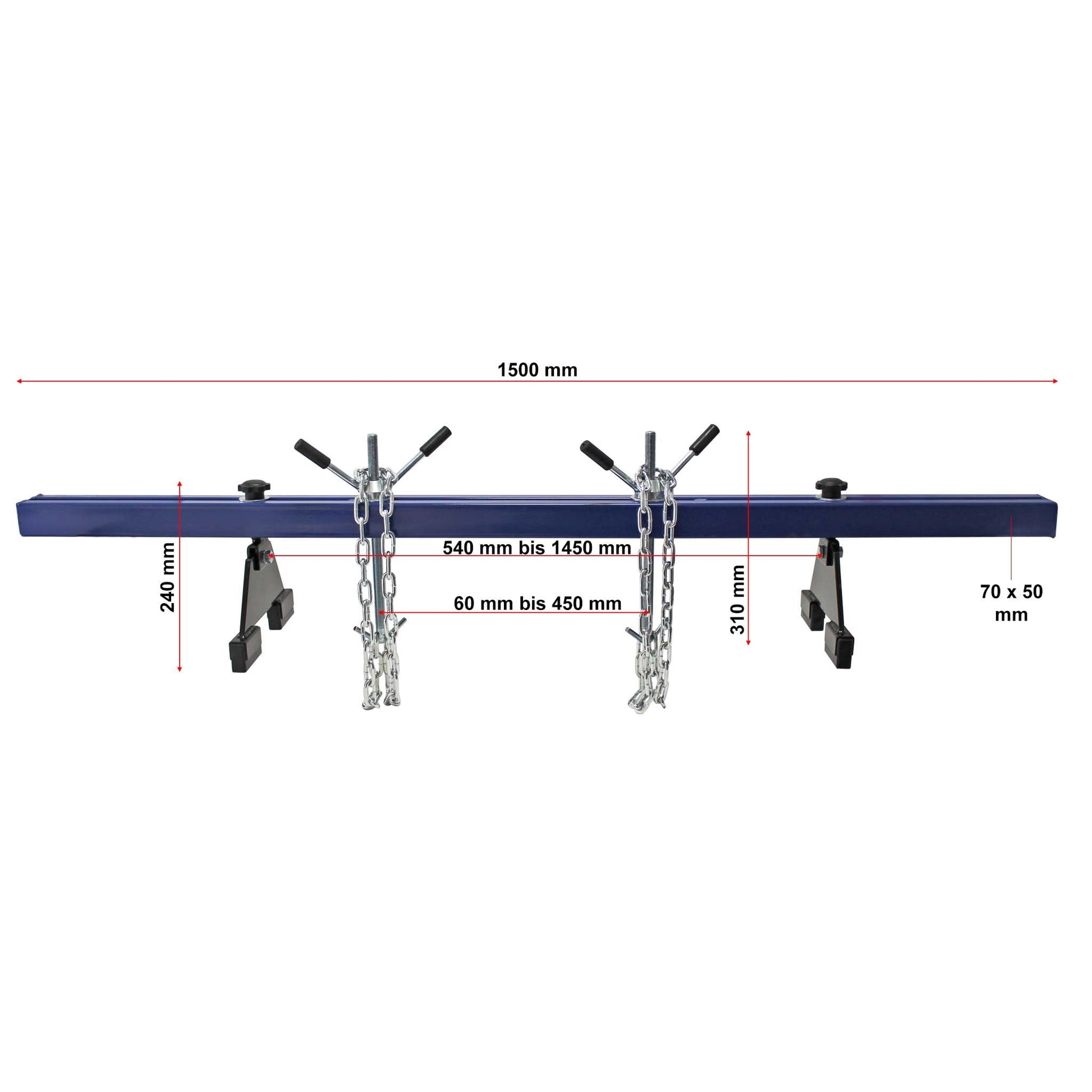 Die Motorbrücke ist für eine maximale Belastung von bis zu 500 kg ausgelegt. Dies gewährleistet höchste Sicherheit bei anspruchsvollen Reparatur- und Wartungsarbeiten an schweren Motoren und Getrieben.