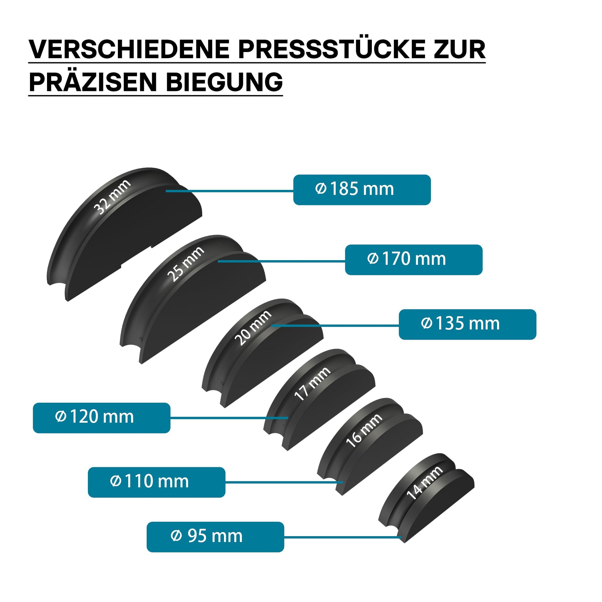 - Umfassendes Zubehör: Im Lieferumfang sind sechs verschiedene Pressstücke für die gängigsten Rohrmasse enthalten, was eine hohe Flexibilität für diverse Projekte gewährleistet.