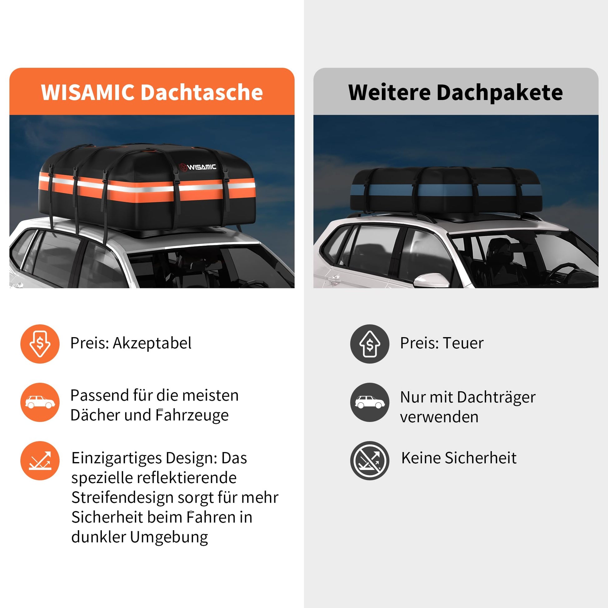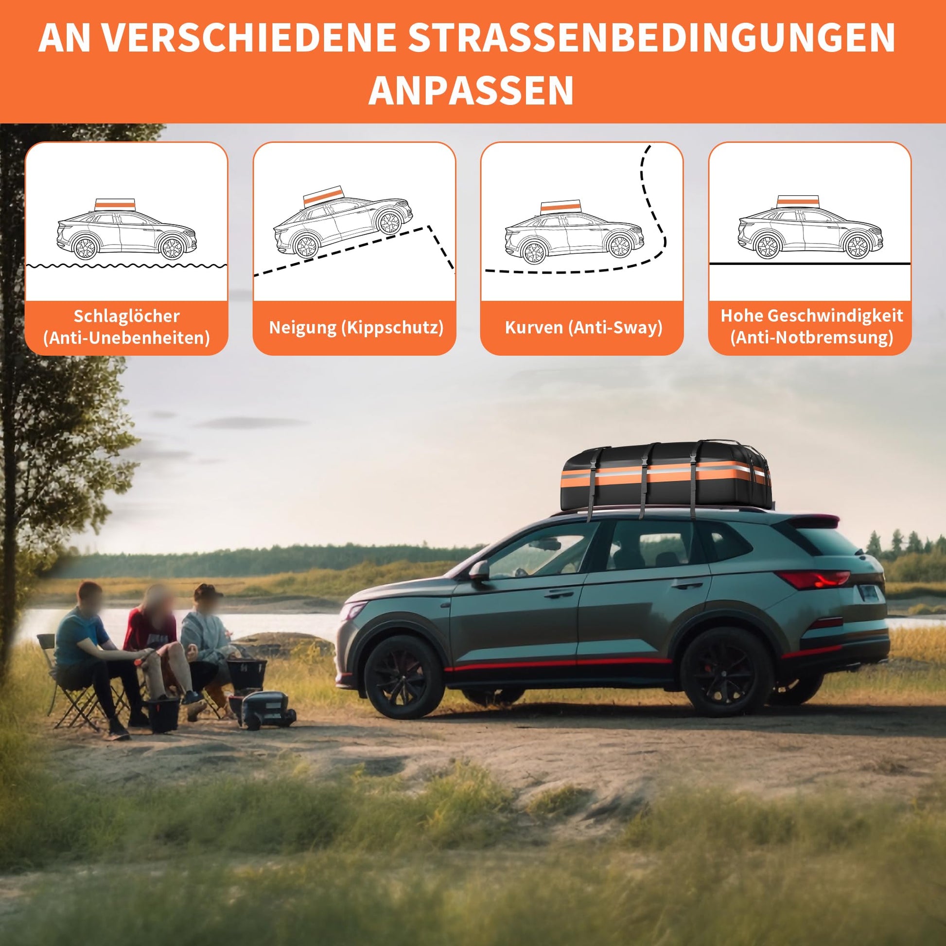 - Universelle Kompatibilität: Dank der mitgelieferten Antirutschmatte und flexiblen Befestigungsgurten eignet sich die Dachtasche für fast alle Fahrzeuge – ob mit oder ohne Dachreling. Ideal für PKW, Vans und SUVs.