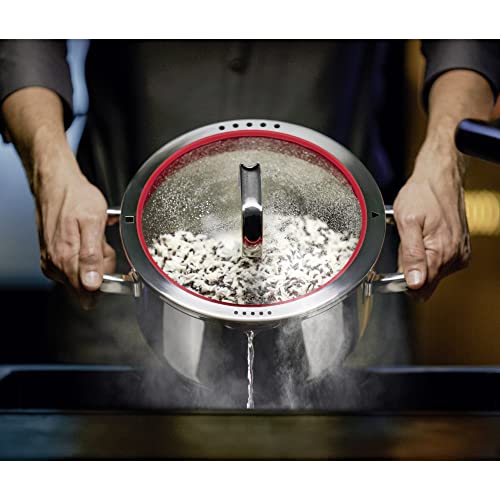Das Herzstück dieses Sets ist der innovative Glasdeckel, dessen Design von der intuitiven Bedienung moderner Geräte inspiriert wurde. Der markante rote Silikonring sorgt nicht nur für einen festen Sitz, sondern ist Teil eines cleveren Systems mit vier einstellbaren Positionen. Giessen Sie Kochwasser von Pasta durch die grossen Öffnungen oder von Reis durch die feinen Sieblöcher direkt ab – ein zusätzliches Sieb wird überflüssig. Die geschlossene Position ist perfekt für schonendes, wasserarmes Garen, während die offene Position ein vollständiges und schnelles Entleeren des Topfes ermöglicht.