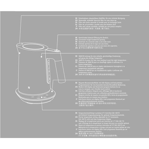 Dank der gradgenauen Temperaturwahl gelingt die Zubereitung von empfindlichen Teesorten wie Grüntee oder weissem Tee sowie von Babynahrung stets perfekt. So entfalten Ihre Getränke und Speisen ihr volles Aroma. Sobald die gewünschte Temperatur erreicht ist, ertönt ein praktisches akustisches Signal. Die elegante Benutzeroberfläche mit beleuchteten Programmtasten garantiert eine besonders benutzerfreundliche und intuitive Bedienung im Alltag.