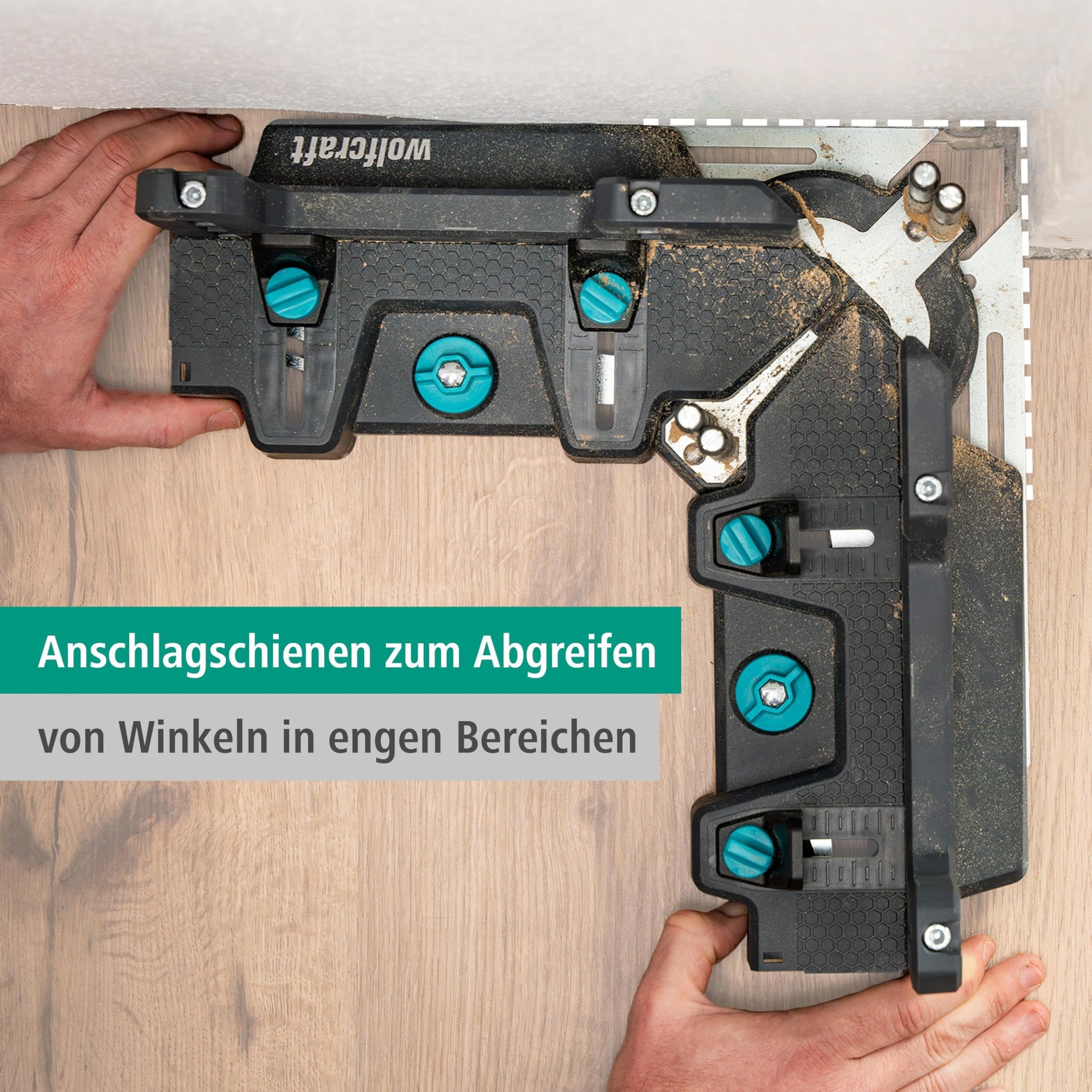 Für schwer zugängliche Ecken oder kurze Wandschenkel verfügt das Werkzeug über integrierte Anschlagschienen aus Metall. Diese erleichtern das präzise Abgreifen des Winkels, der anschliessend mit den Feststellschrauben für den Transport zur Säge sicher arretiert wird.
