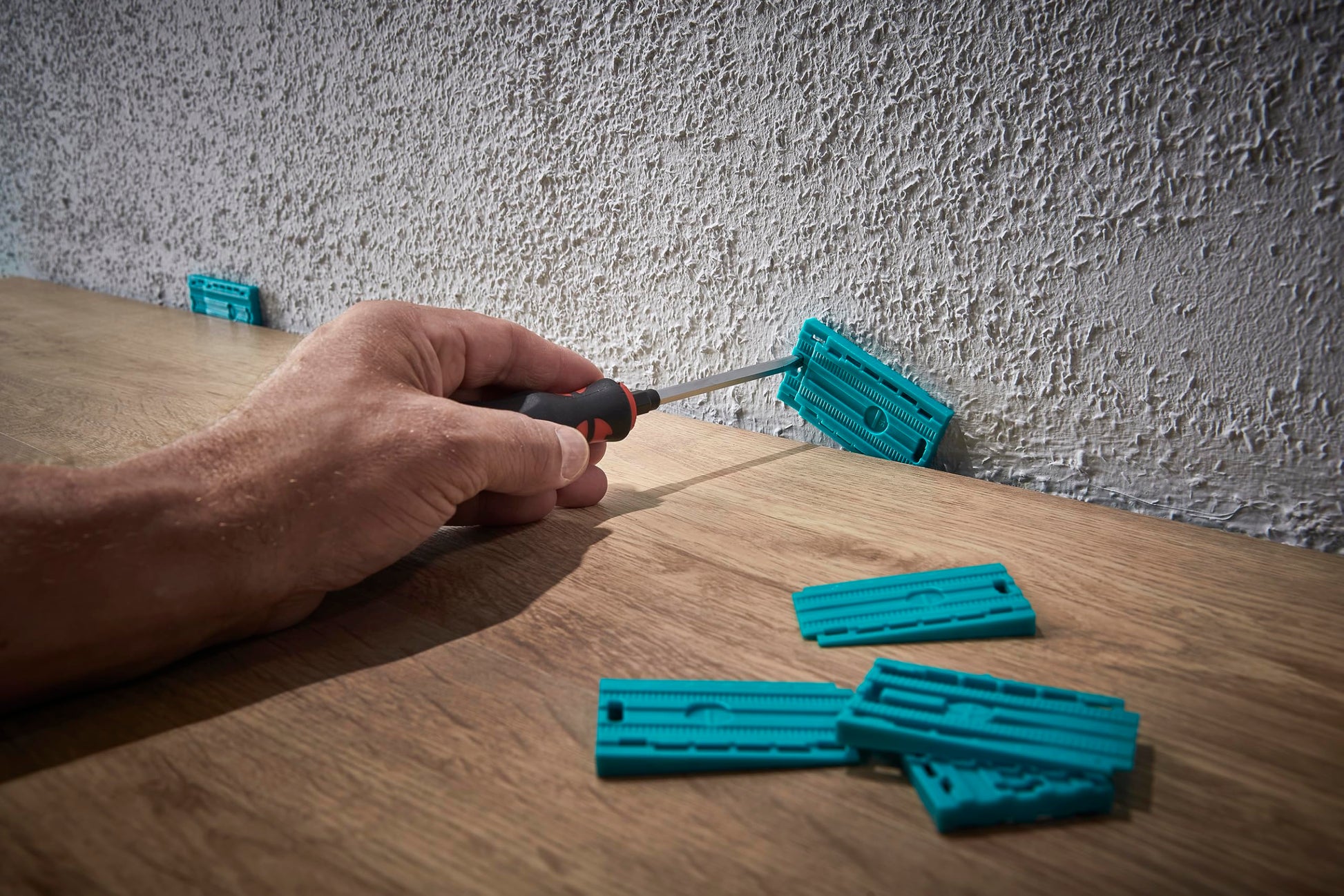 Die 30 mitgelieferten Universal-Keile sind wahre Multitalente. Durch ihre praktische Rasterung können Sie die gewünschte Distanz exakt einstellen und beibehalten, was wiederholtes Nachjustieren überflüssig macht. Das spart wertvolle Zeit und sorgt für ein perfekt gleichmässiges Verlegebild bei Parkett und Laminat, ist aber auch eine grosse Hilfe beim Einsetzen von Fenstern und Türen.