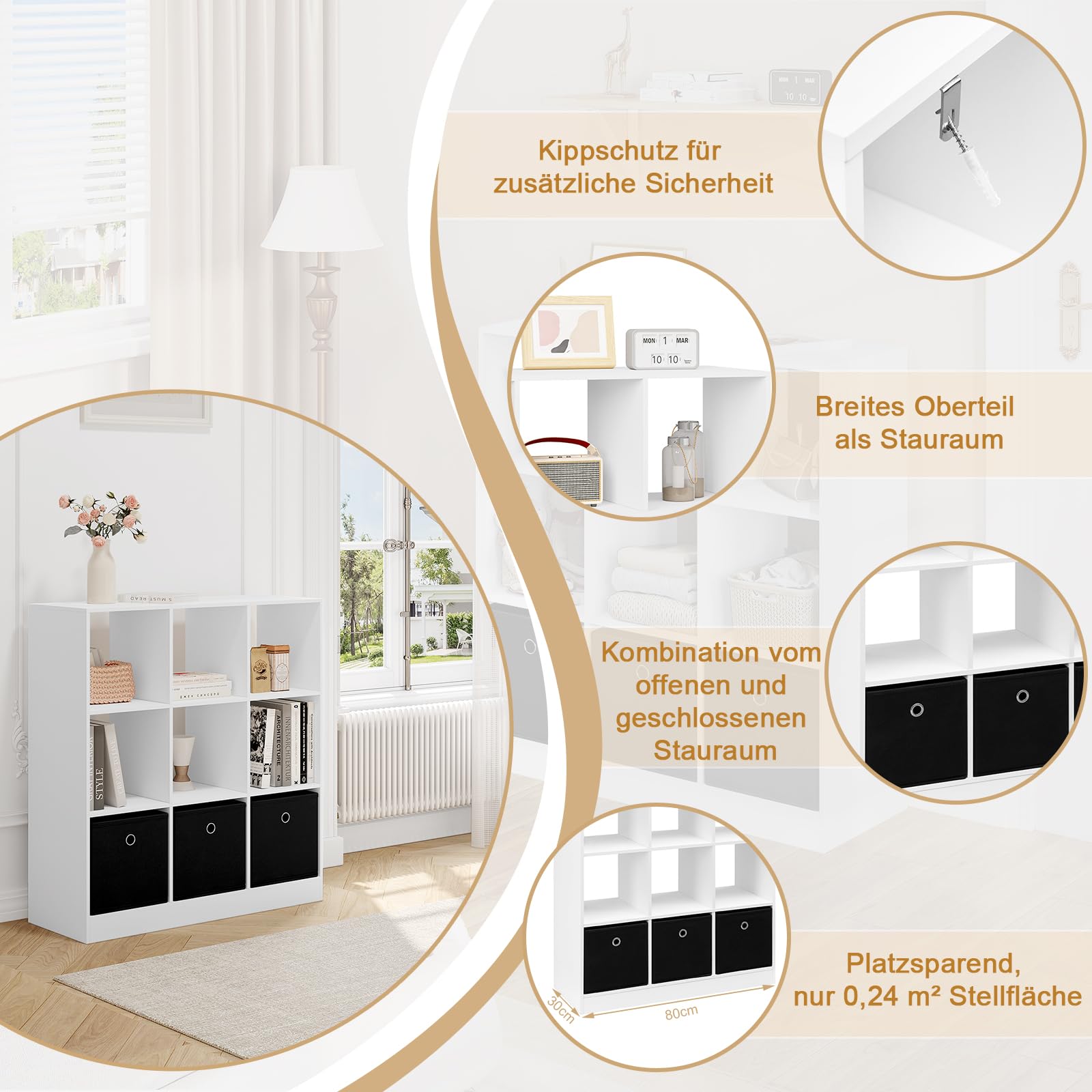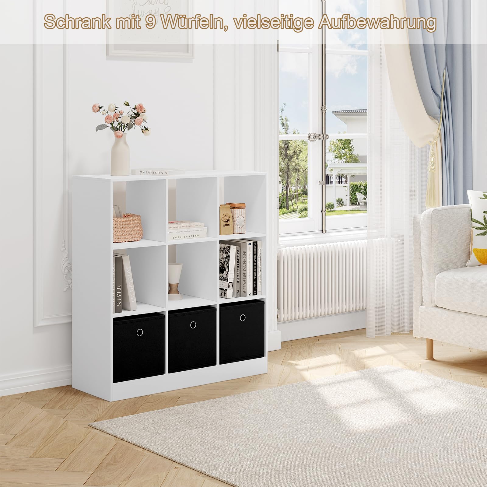 - Grosszügiger Stauraum: Neun offene Fächer bieten reichlich Platz, ergänzt durch drei flexible Stoffschubladen für eine staubfreie Aufbewahrung von Kleidung, Spielzeug oder Accessoires.