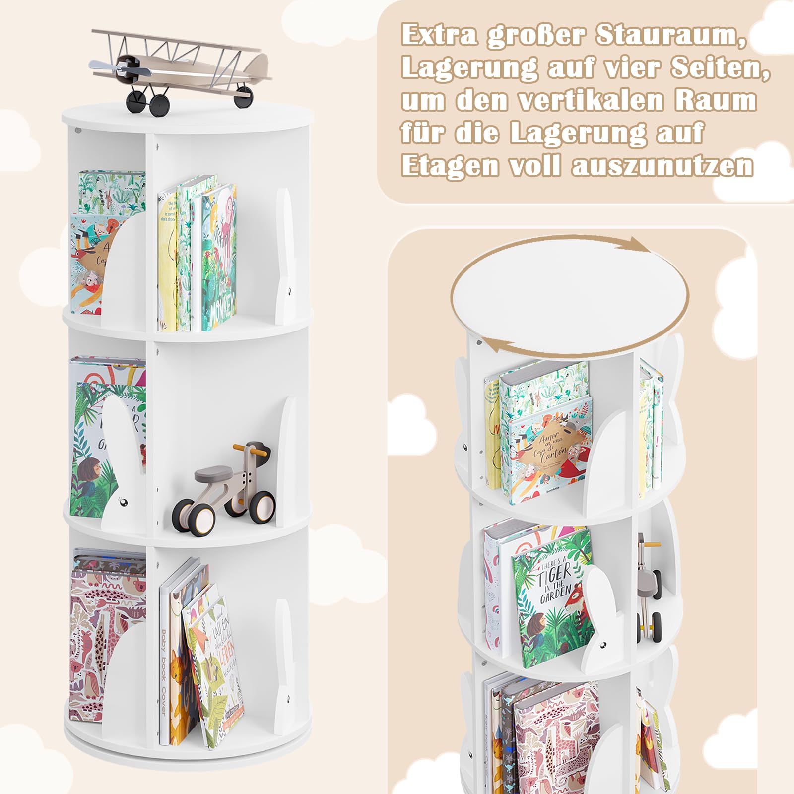 Absolut! Dank der leichtgängigen 360°-Drehbasis können Kinder ihre Lieblingsbücher und Spielsachen mühelos von allen Seiten erreichen. Die drei unterteilten Ebenen und die offene Ablage oben bieten reichlich Platz und motivieren durch das verspielte Hasenohren-Design zum eigenständigen Aufräumen.