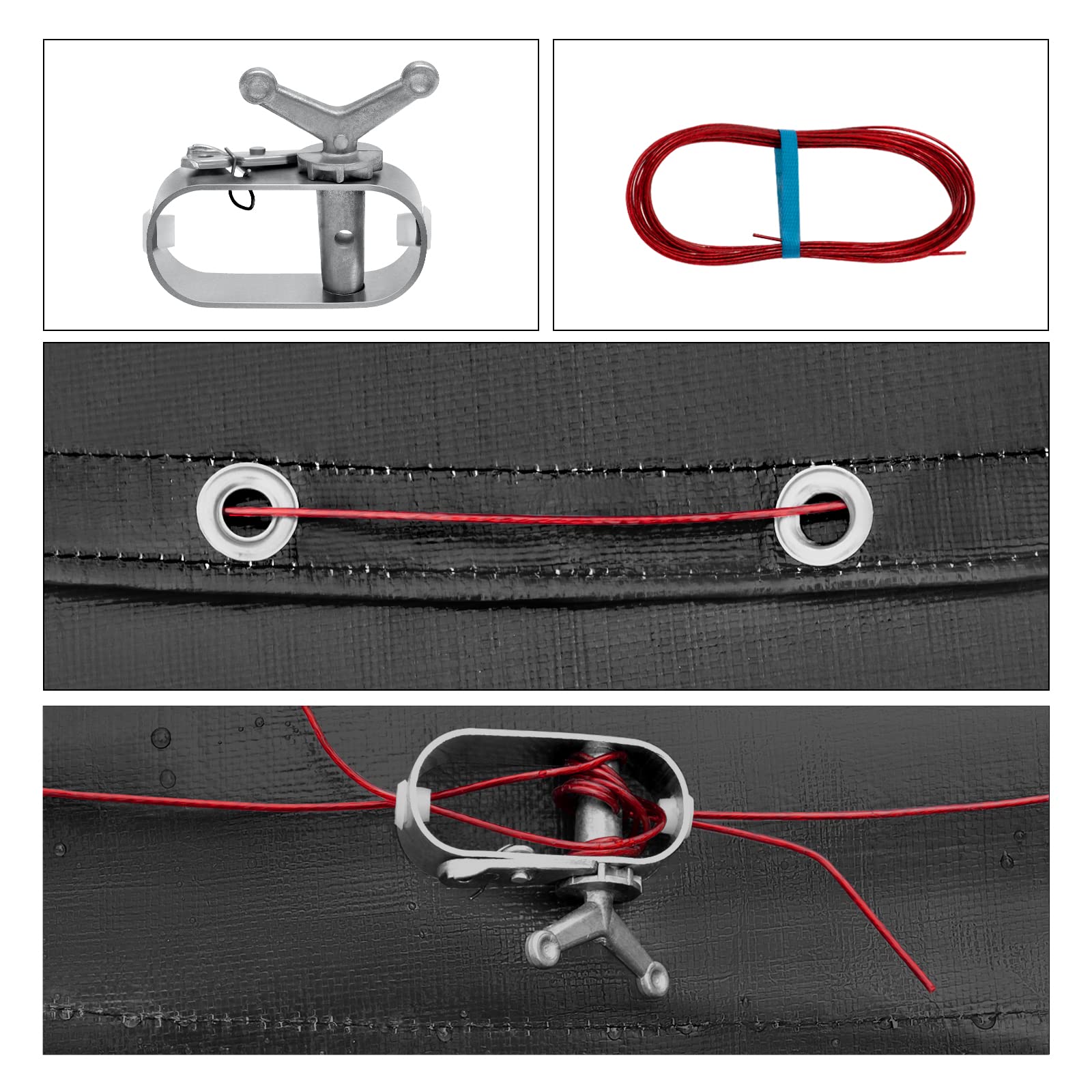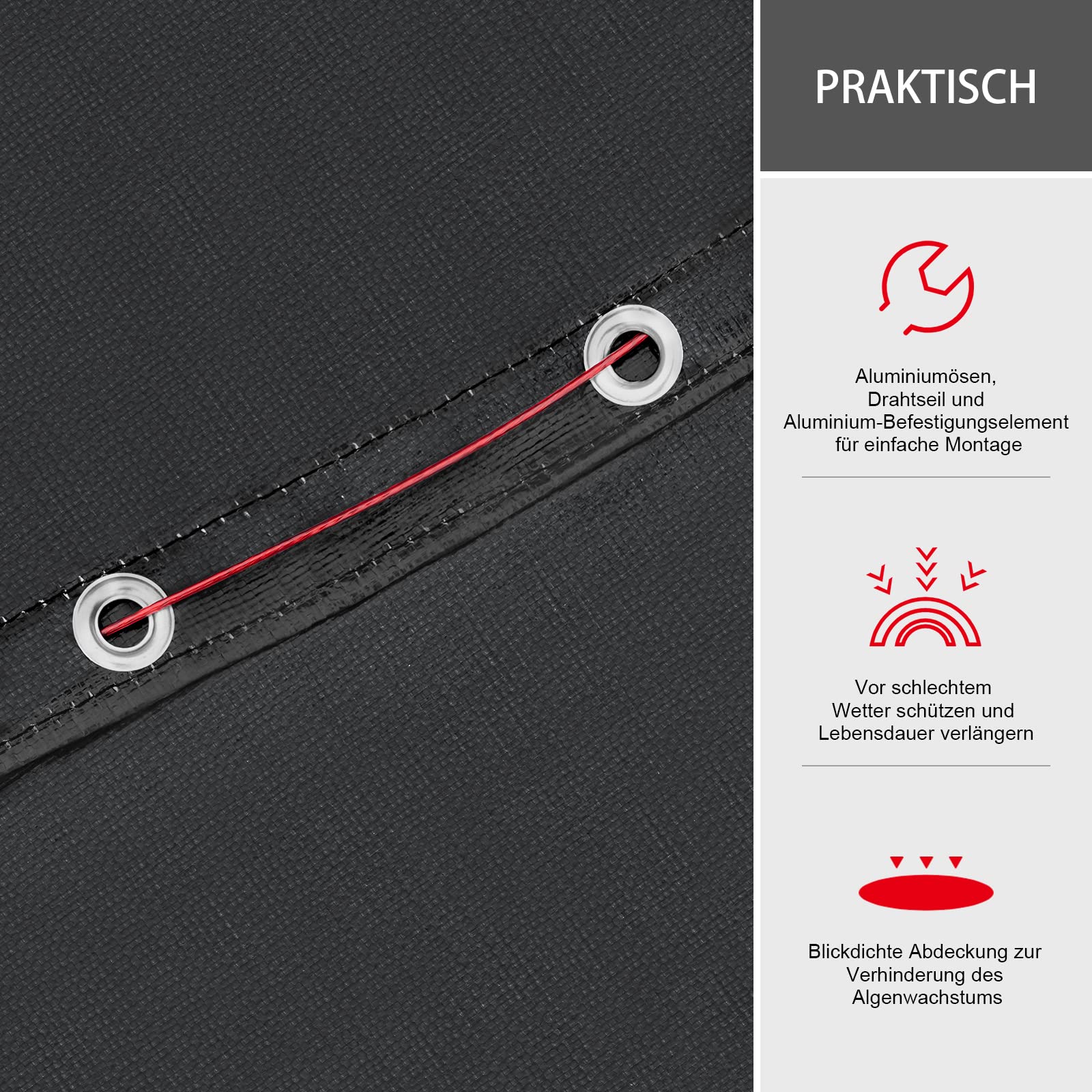 - Sichere Befestigung: Rundum angebrachte Aluminiumösen ermöglichen ein einfaches Durchführen des mitgelieferten Drahtseils. Mithilfe des integrierten Befestigungselements lässt sich die Plane stabil und windfest am Beckenrand verspannen.