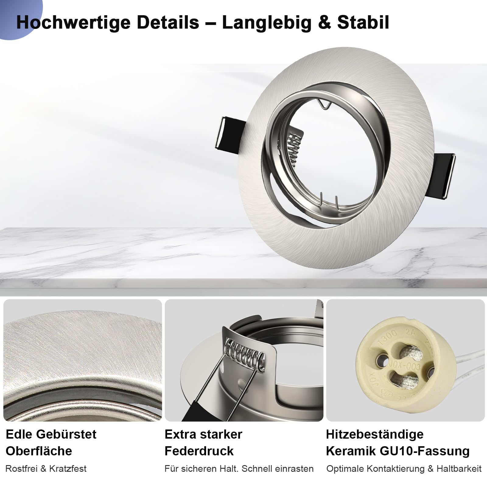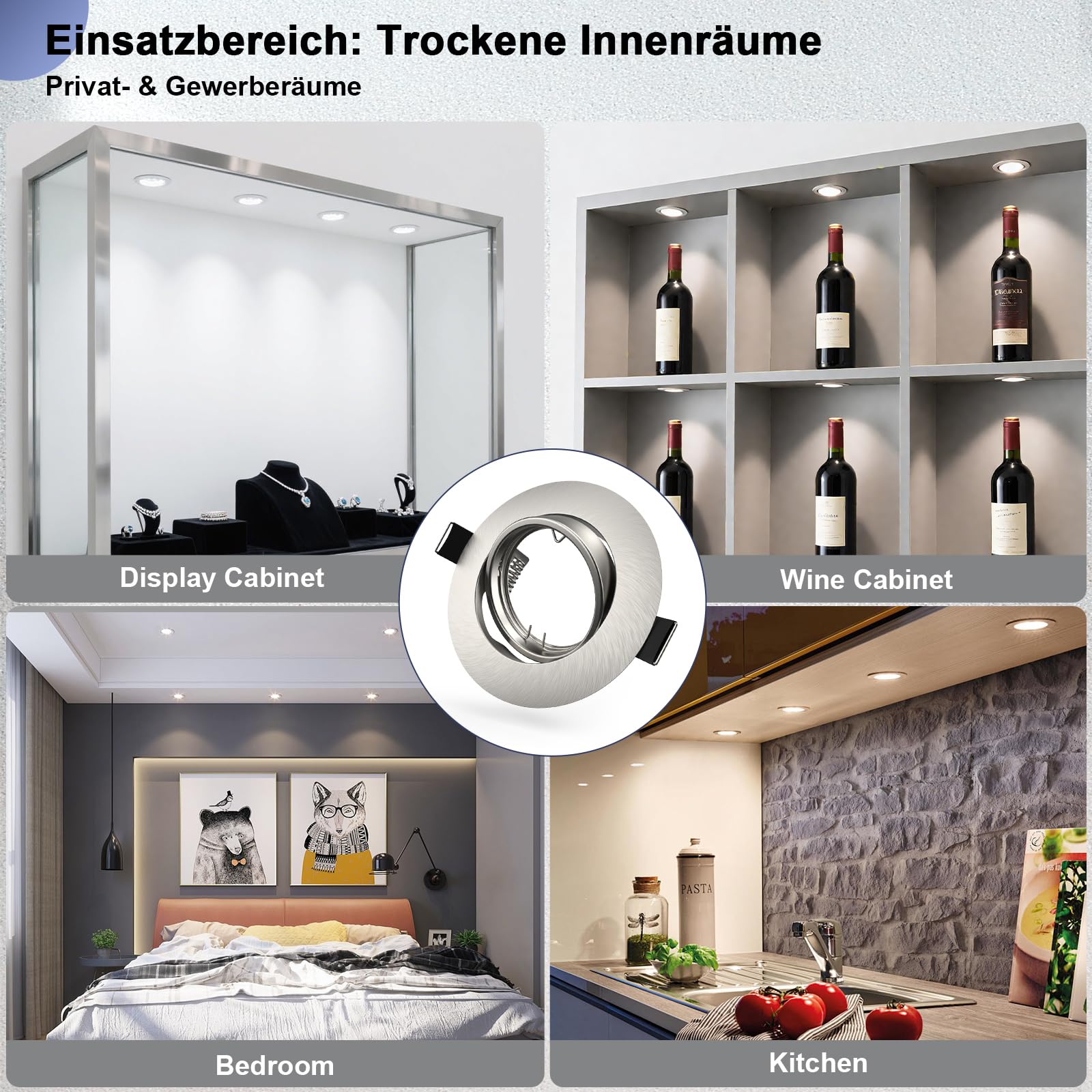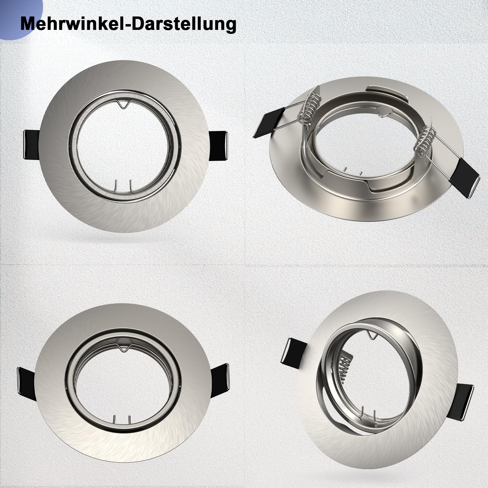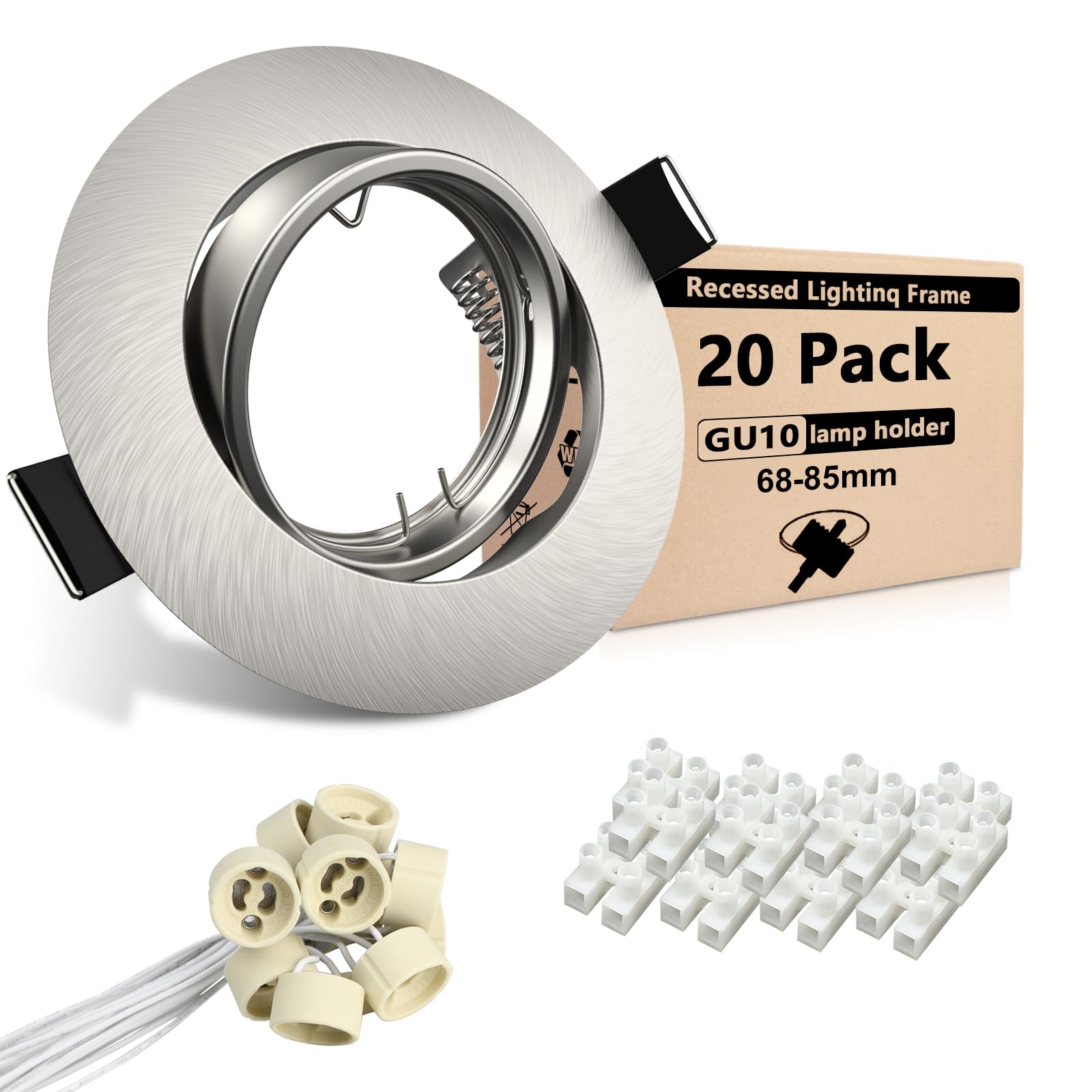 Das Set ist eine Komplettlösung für 20 Lichtpunkte und enthält 20 Einbaurahmen aus gebürstetem Edelstahl, 20 passende GU10-Fassungen, 20 Federringklemmen zur Befestigung sowie 20 Verkabelungs-Terminals. Lediglich die Leuchtmittel (Birnen) sind nicht inbegriffen.