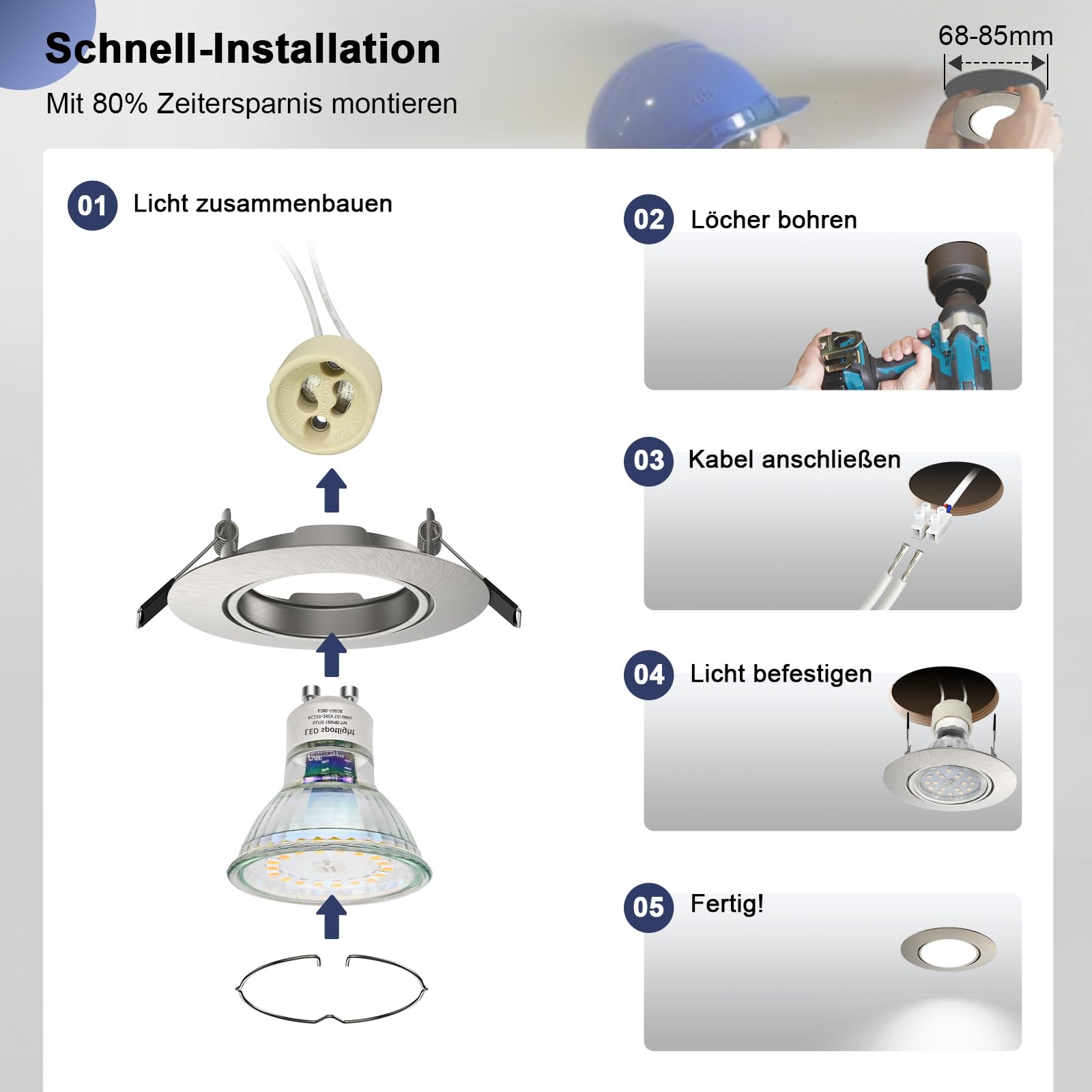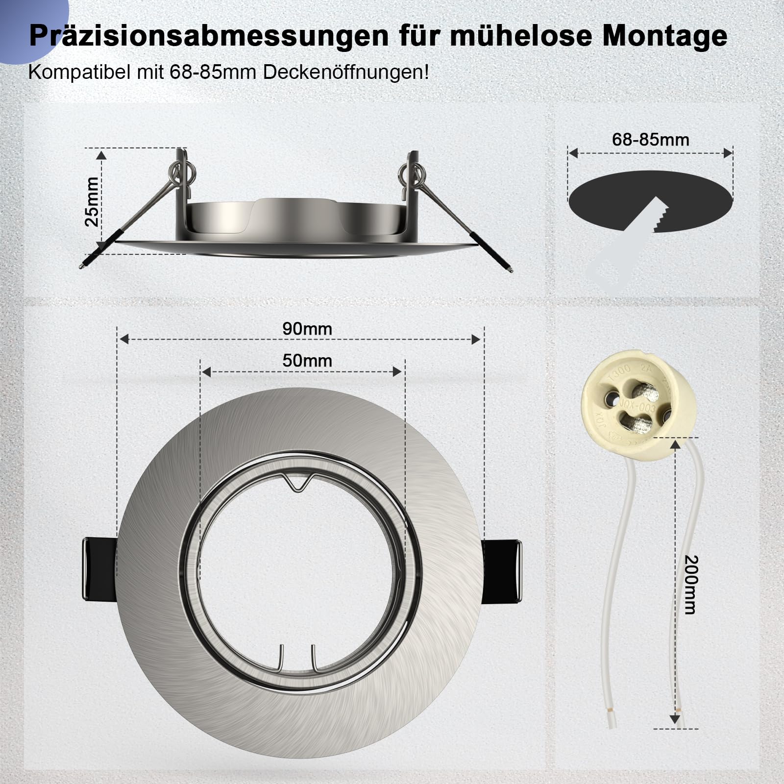 - Standard-Einbaumass: Geeignet für Deckenausschnitte mit einem Durchmesser von 68 bis 85 mm.