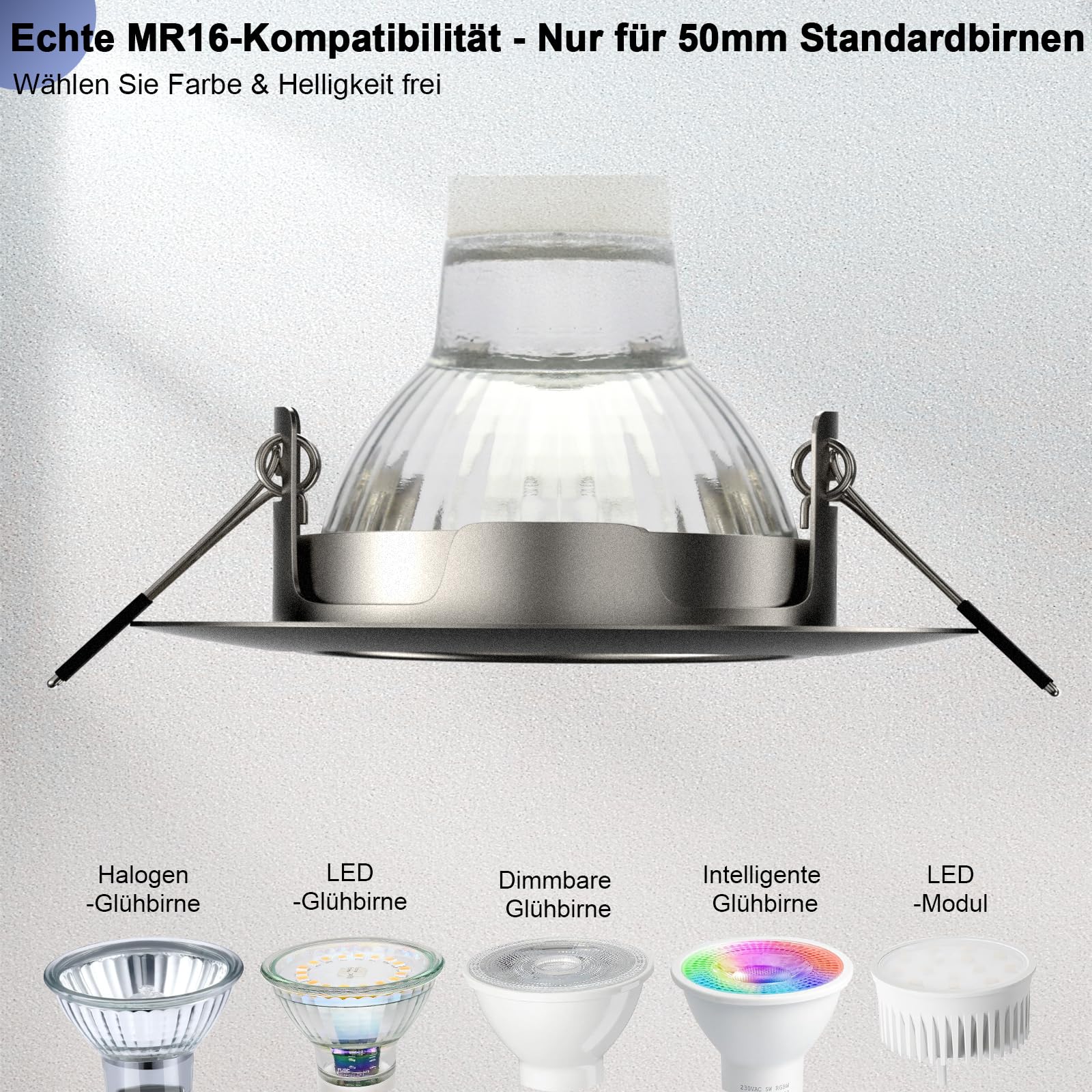 Die mitgelieferten GU10-Fassungen sind universell einsetzbar und eignen sich sowohl für moderne, energiesparende LED-Leuchtmittel als auch für klassische Halogenleuchtmittel. Sie haben somit die freie Wahl bei der Gestaltung Ihrer Lichtatmosphäre.
