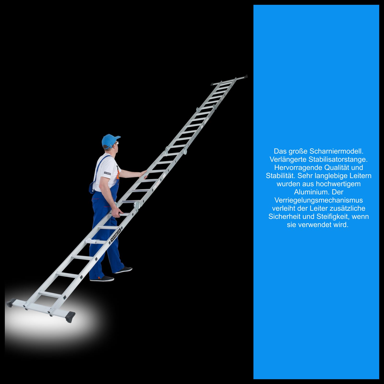 Diese Leiter ist extrem vielseitig. Sie kann als gerade Anlegeleiter mit einer maximalen Höhe von 6,70 m und als freistehende Stehleiter (A-Form) mit einer Höhe von 3,02 m verwendet werden. Dank der 4 Segmente mit je 6 Sprossen lässt sie sich flexibel an verschiedene Aufgaben anpassen.