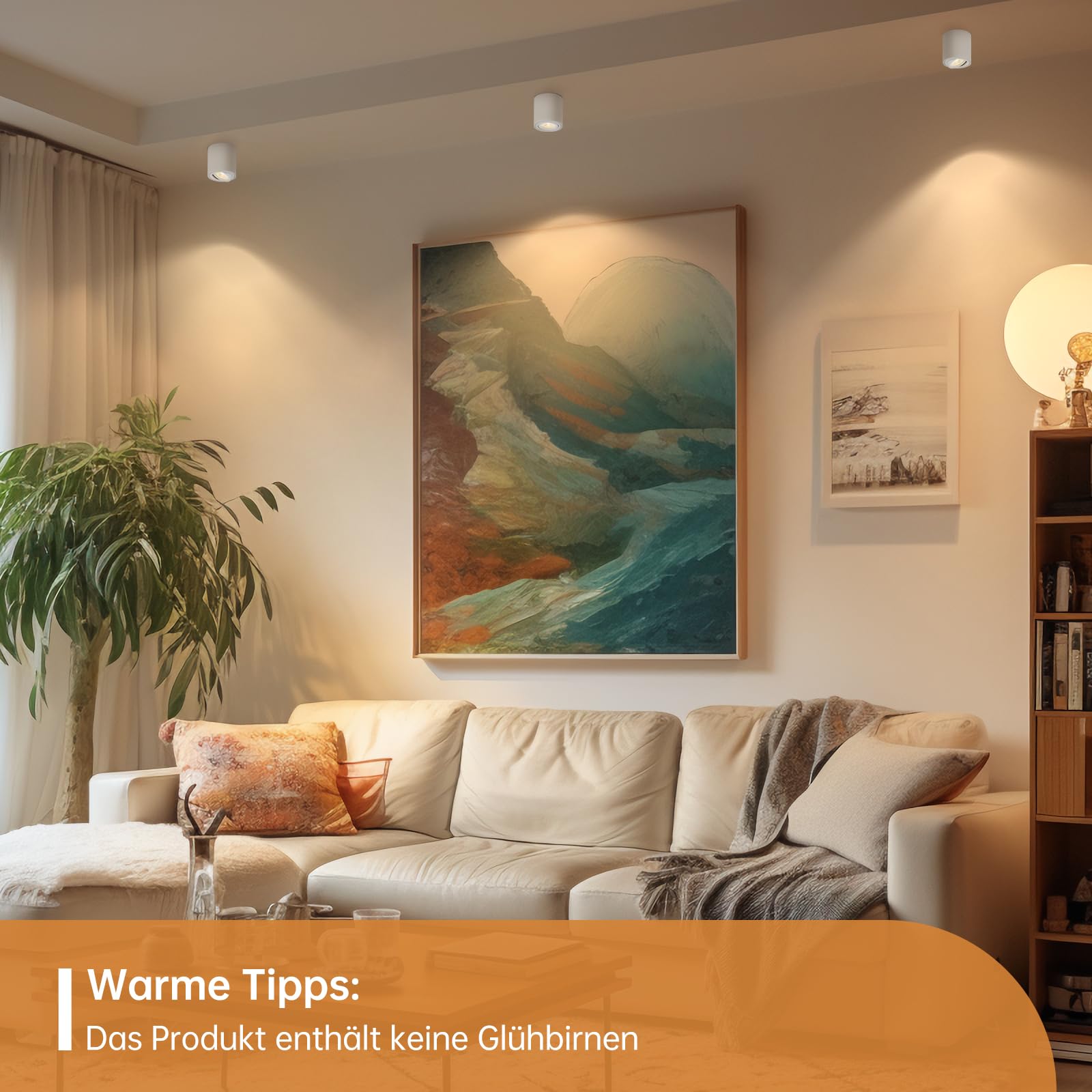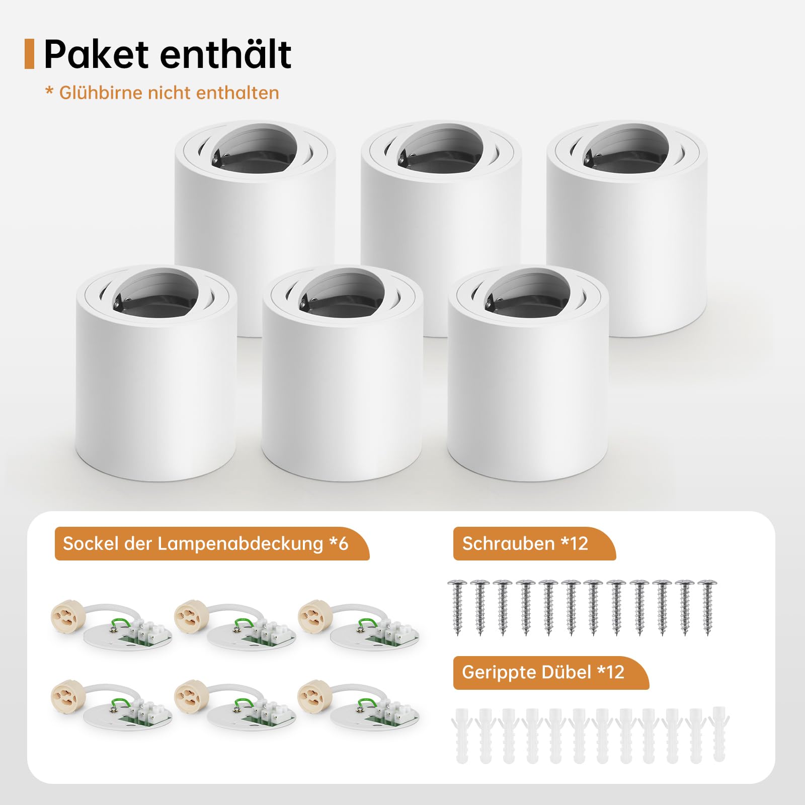 Das Set enthält sechs weisse Aufbauspots aus Aluminium sowie das für die Montage benötigte Schraubenset. Leuchtmittel vom Typ GU10 sind nicht im Lieferumfang enthalten und müssen separat erworben werden.