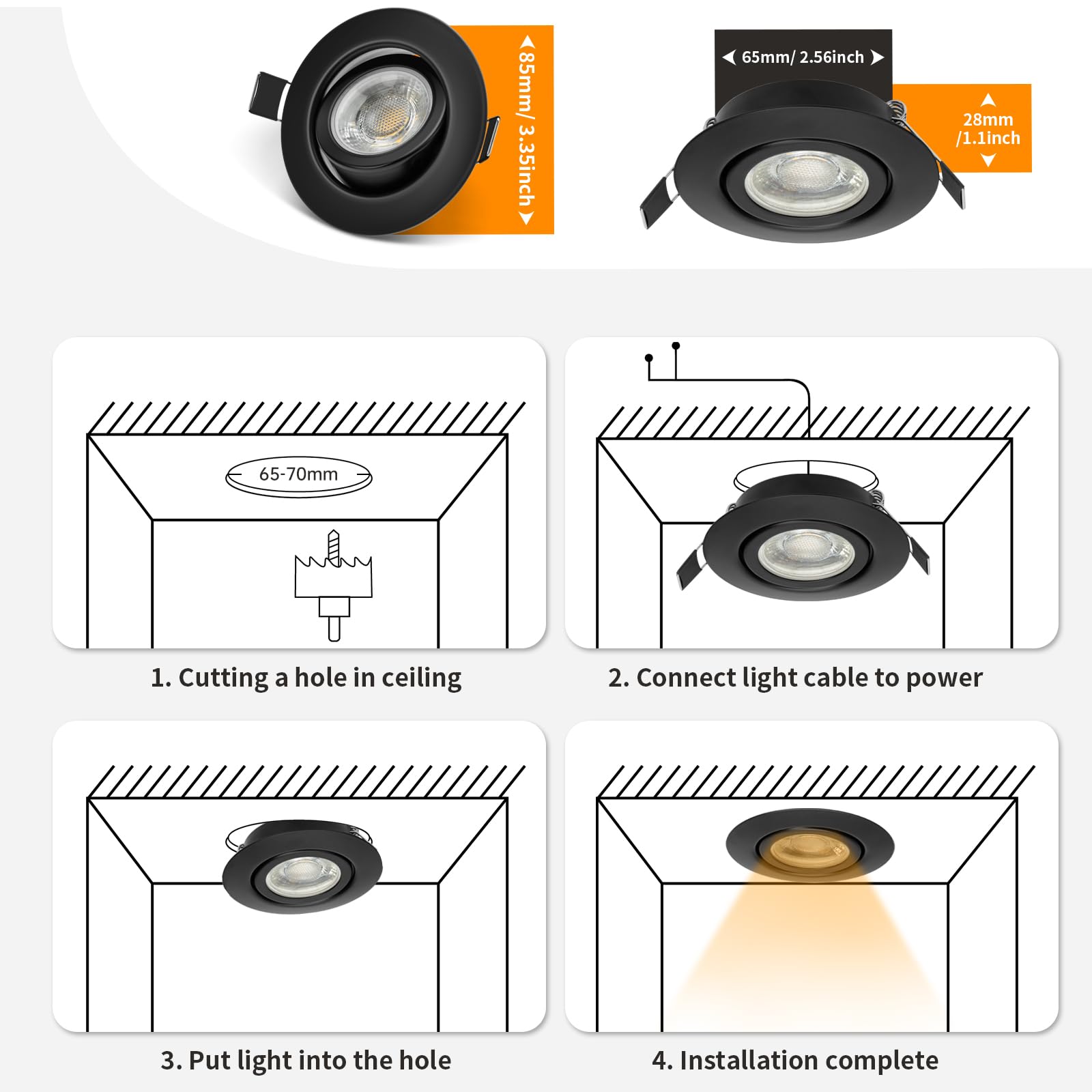 - Extra flaches Design: Mit einer minimalen Einbautiefe von ca. 35 mm und einer Gehäusedicke von nur 28 mm eignen sich diese Strahler auch für Decken mit geringem Platzangebot. Sie passen perfekt in Standard-Bohrungen von 68 bis 75 mm.