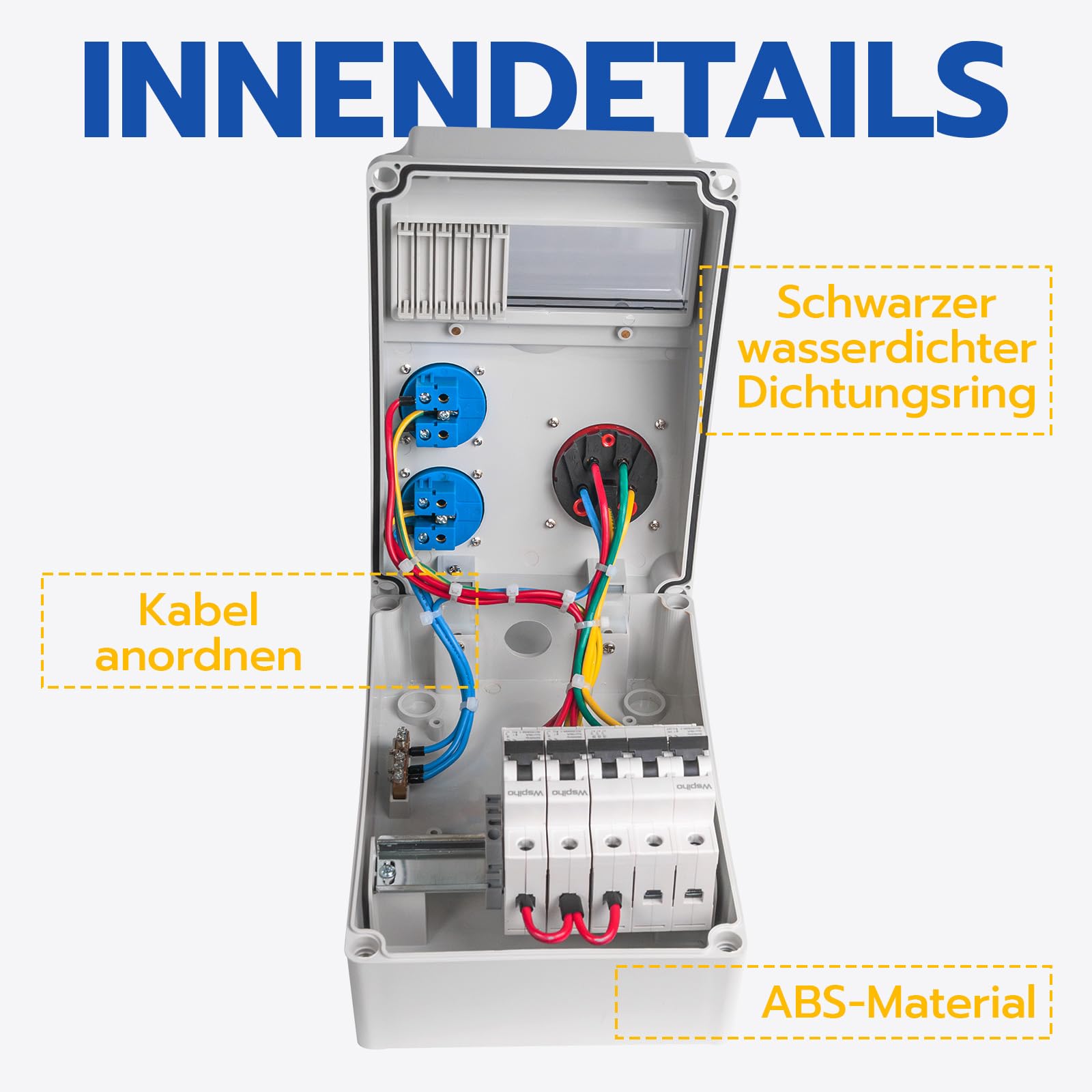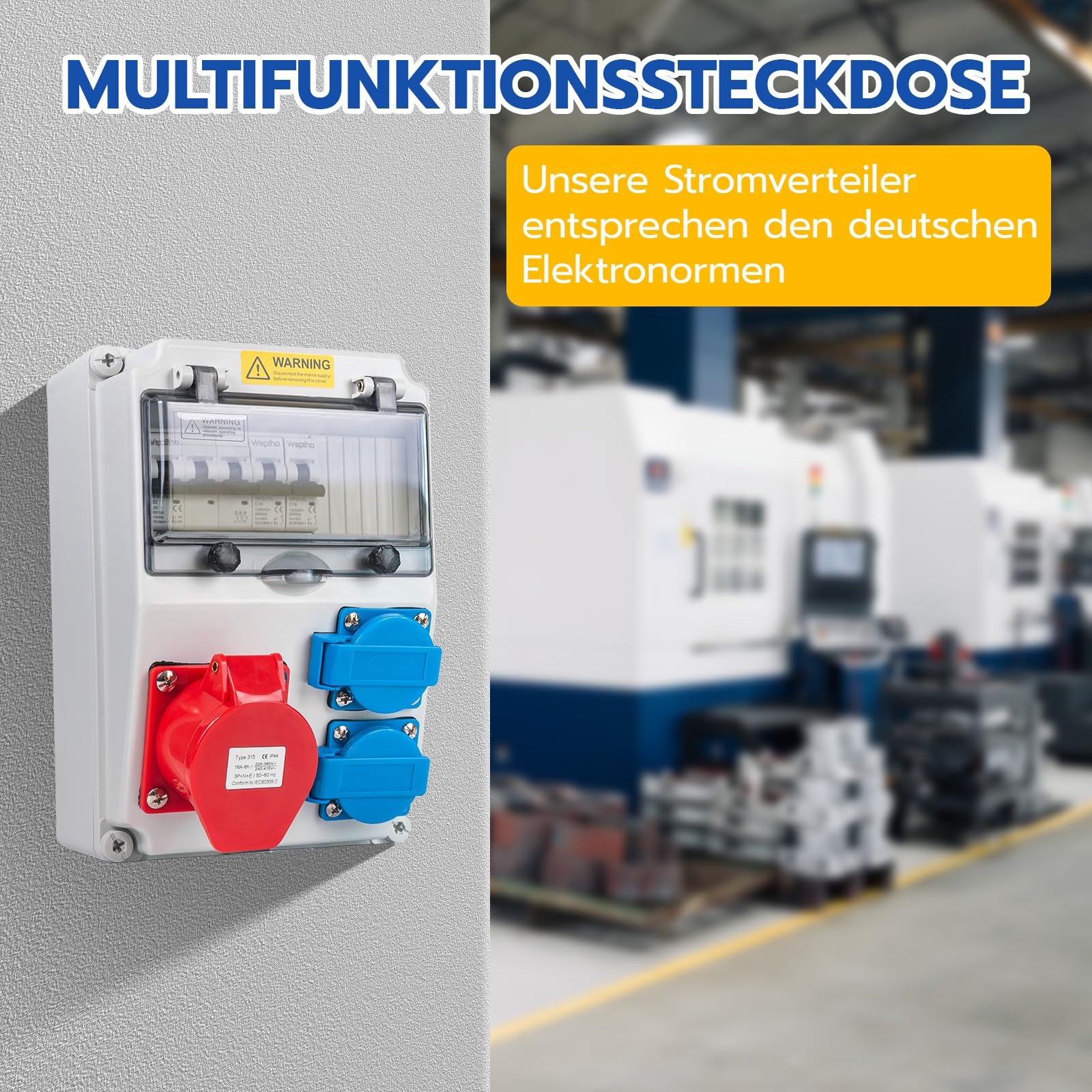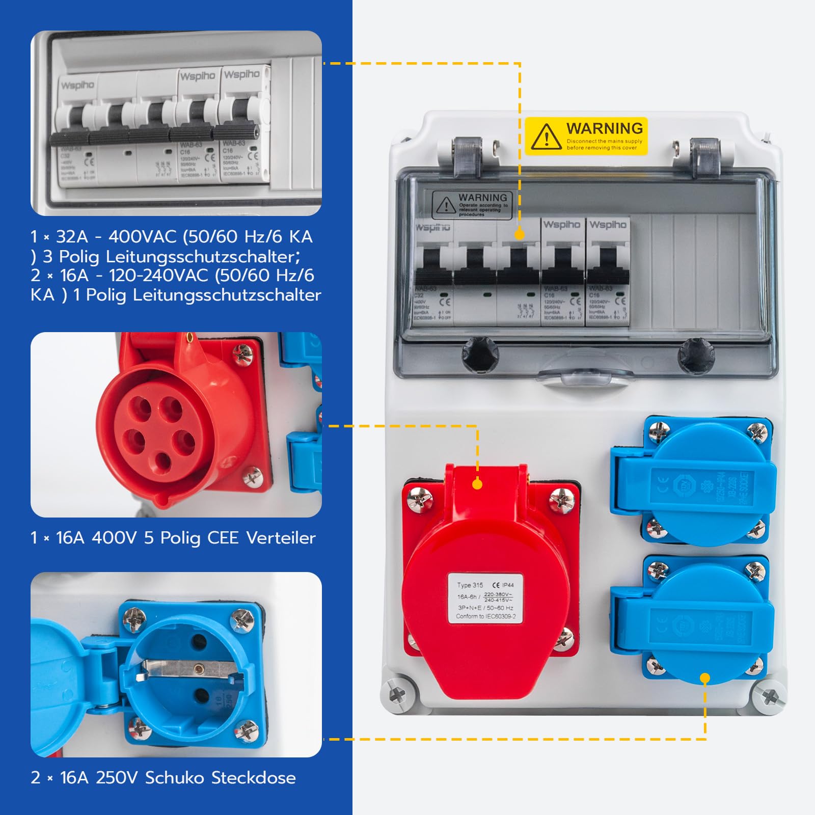 - Leistungsstarke Absicherung: Ausgestattet mit einem 3-poligen 32A und zwei 1-poligen 16A Leitungsschutzschaltern für umfassende Sicherheit Ihrer angeschlossenen Geräte.