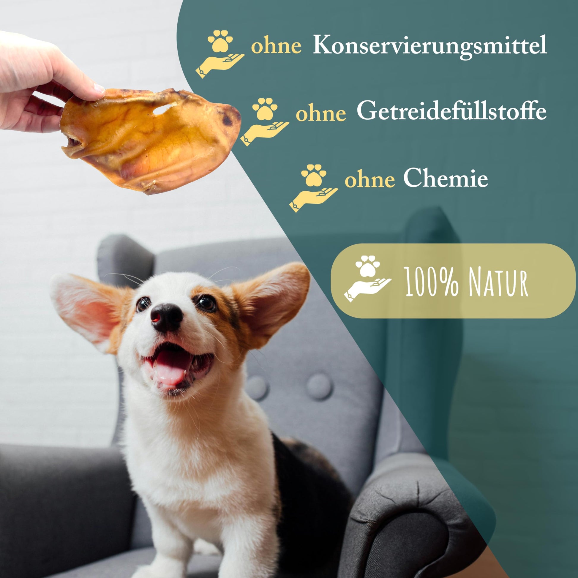 - 100% naturbelassen: Diese getrockneten Schweineohren sind ein reines Naturprodukt, frei von jeglichen chemischen Zusatzstoffen und daher besonders bekömmlich.