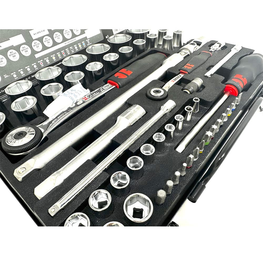 Dieses umfangreiche Steckschlüssel-Sortiment ist der ideale Begleiter für professionelle Anwender und anspruchsvolle Heimwerker. Mit 56 Teilen, die sowohl den 1/4-Zoll- als auch den 1/2-Zoll-Antrieb abdecken, bietet dieses Set eine vielseitige Ausrüstung für eine breite Palette an Schraubarbeiten, sicher verstaut in einer robusten Metallkassette.