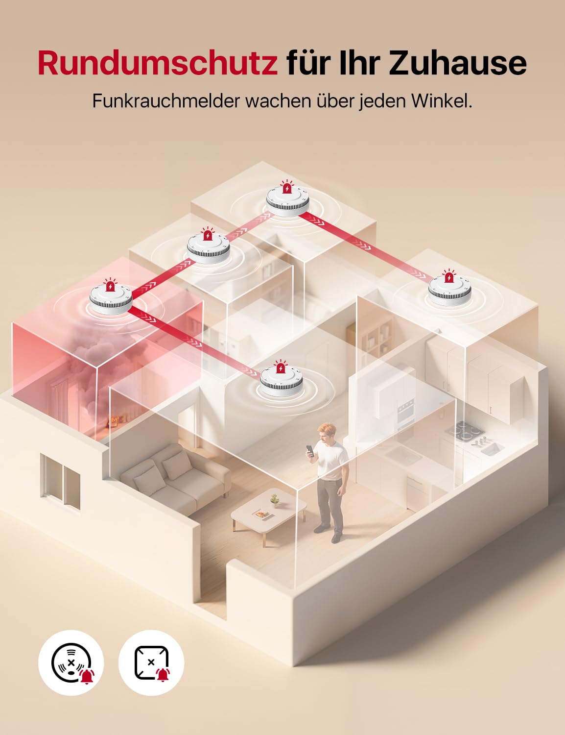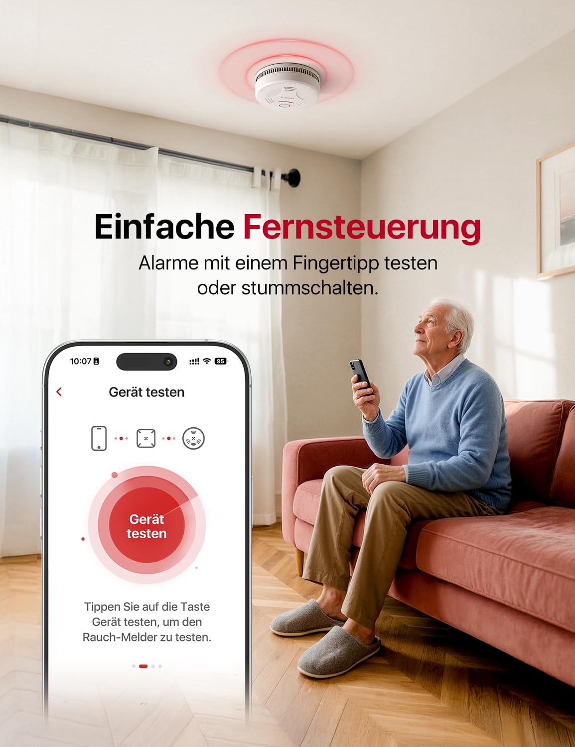 - Bequeme Steuerung per App: Führen Sie Funktionstests durch oder schalten Sie einen Alarm direkt von Ihrem Smartphone aus stumm – sicher und bequem, ohne auf eine Leiter steigen zu müssen.