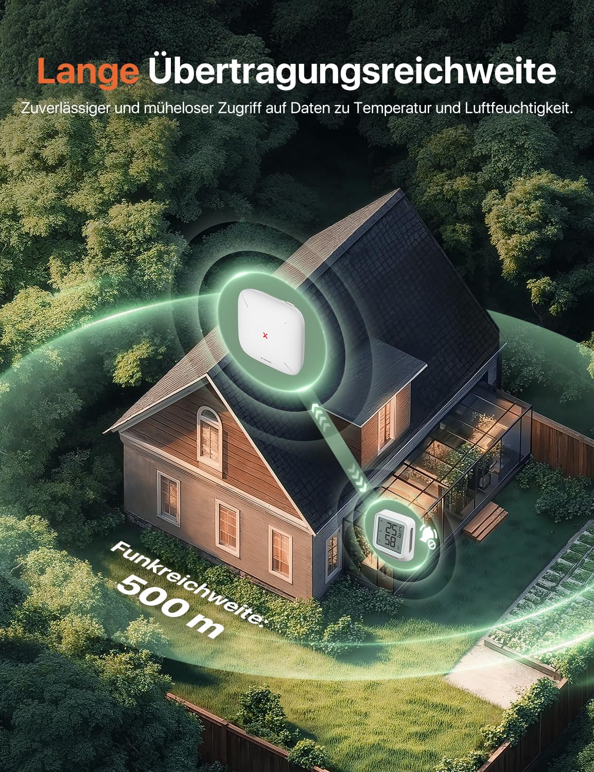 Die Sensoren sind dank eines hochpräzisen Schweizer Sensors äusserst genau, mit einer Abweichung von nur ±0,2 °C bei der Temperatur und ±2 % bei der Luftfeuchtigkeit. Mit einer Funkreichweite von bis zu 500 Metern im Freien sind sie ideal für grosse Wohnungen, mehrstöckige Häuser und die Überwachung von Kellerräumen.