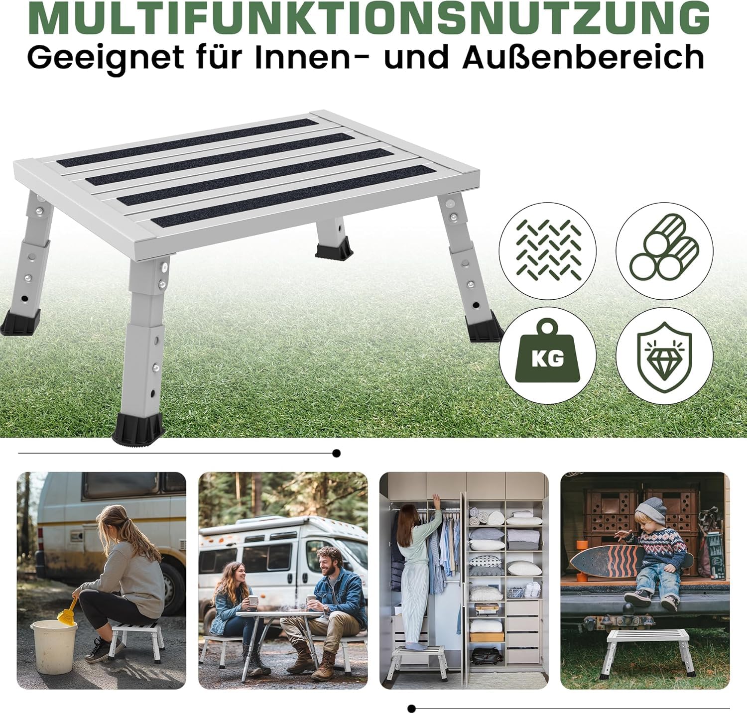 Er ist ein vielseitiger Helfer für zahlreiche Situationen. Ideal als Einstiegshilfe für Wohnmobile, Wohnwagen und hohe SUVs, beim Camping, für die Autowäsche, als praktische Stufe in der Küche oder im Haushalt sowie als stabile und flexible Alltagshilfe für Senioren oder Personen mit eingeschränkter Mobilität.