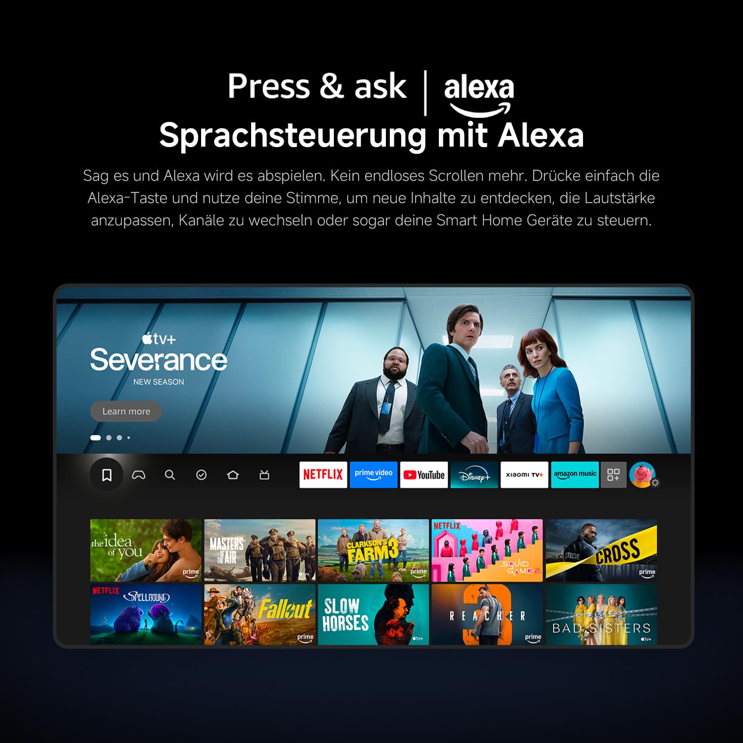 - Alexa-Sprachsteuerung: Nutzen Sie die Alexa-Taste auf der Fernbedienung, um per Sprachbefehl nach Filmen zu suchen, die Lautstärke zu regeln oder Ihre kompatiblen Smart-Home-Geräte zu steuern.