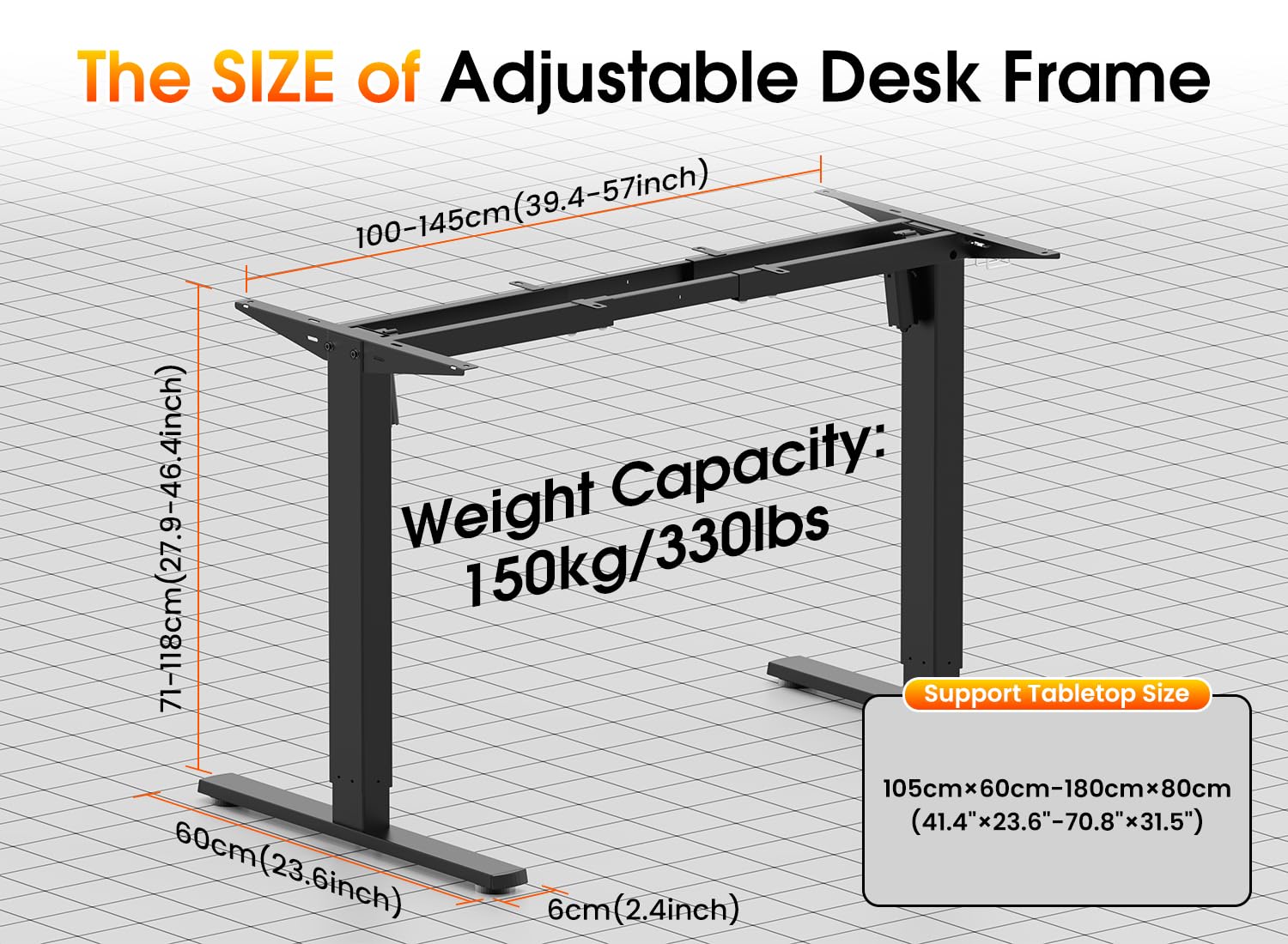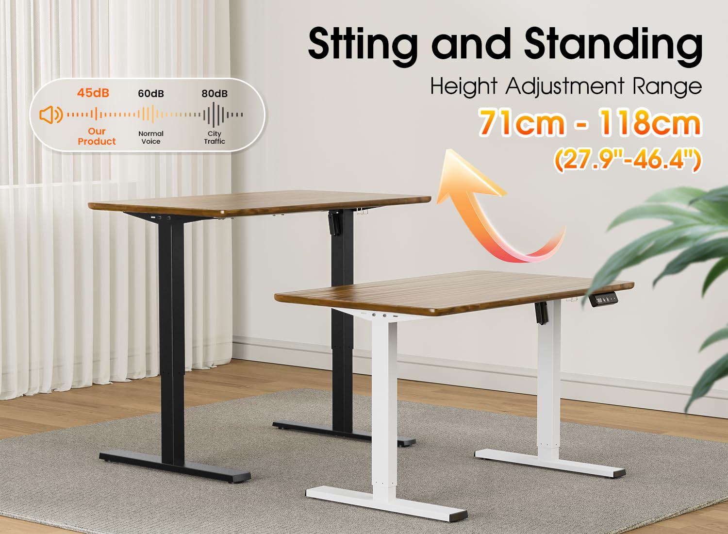 - Stufenlose Höhenverstellung: Die Arbeitshöhe lässt sich elektrisch von 71 cm bis zu 118 cm (ohne Tischplatte) anpassen, ideal für den Wechsel zwischen Sitzen und Stehen.