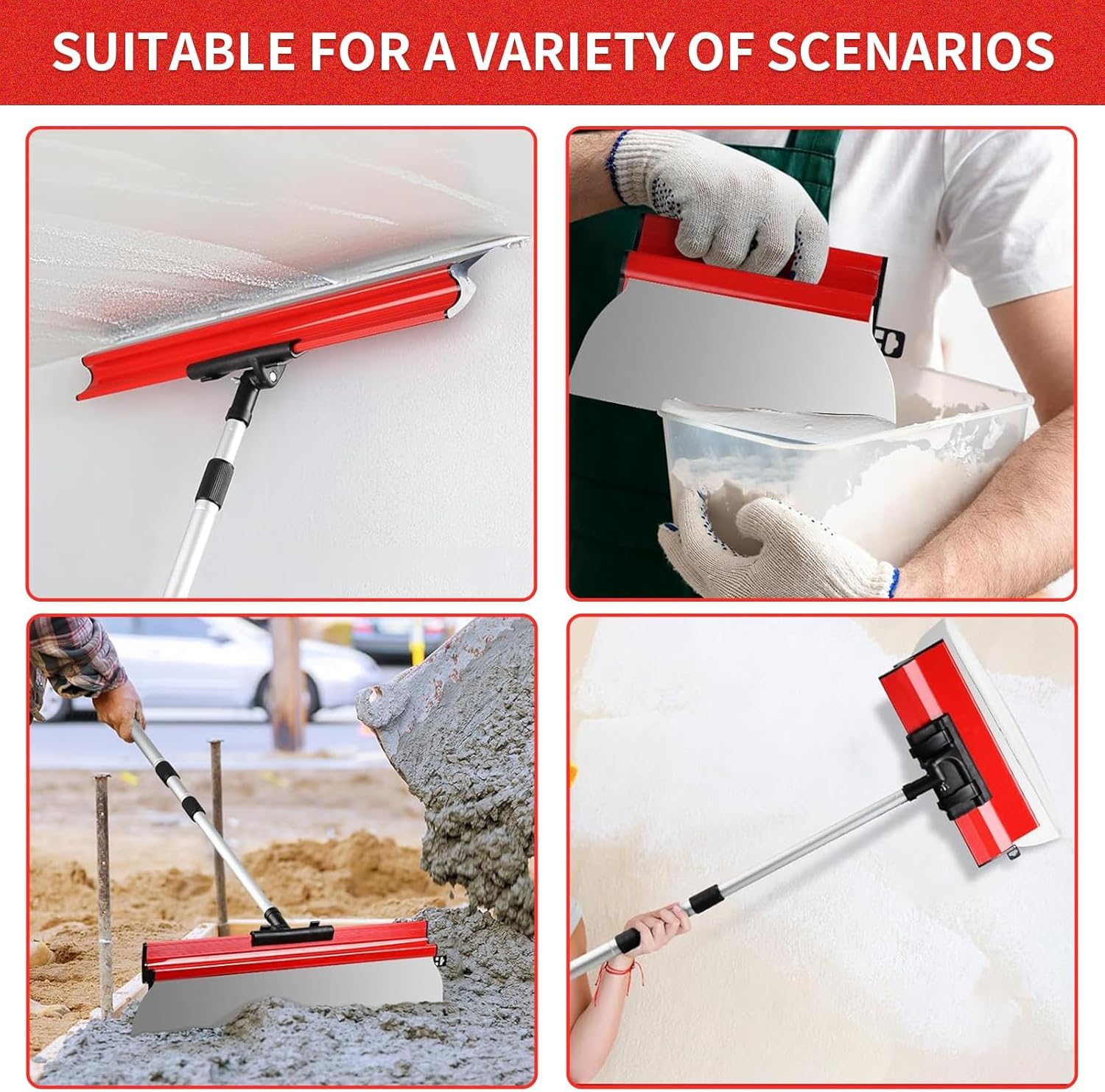 Das Set besteht aus vier Flächenspachteln in den Breiten 25 cm, 40 cm, 60 cm und 80 cm. Jede Spachtel wird mit zwei auswechselbaren Edelstahlklingen (0,38 mm und 0,5 mm), einem ausziehbaren Teleskopgriff (73,5 cm - 128 cm) und einer robusten Verpackung zur sicheren Aufbewahrung geliefert.