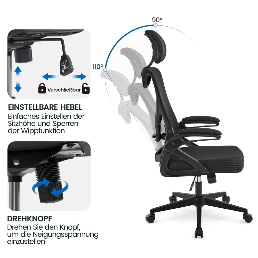 - 90° hochklappbare Armlehnen: Für maximale Bewegungsfreiheit können die Armlehnen einfach nach oben geklappt werden. Dies ermöglicht auch ein platzsparendes Verstauen des Stuhls unter dem Schreibtisch.
