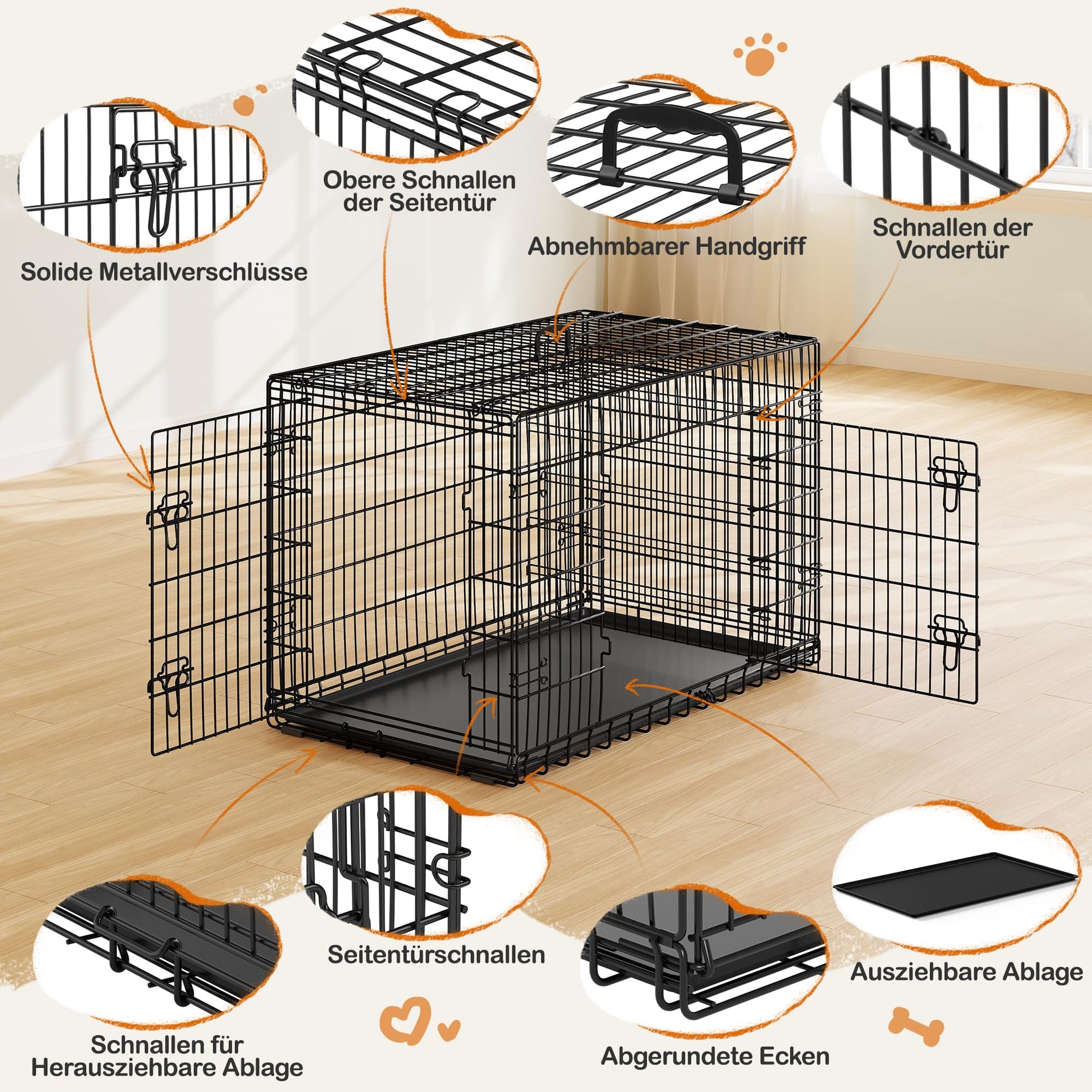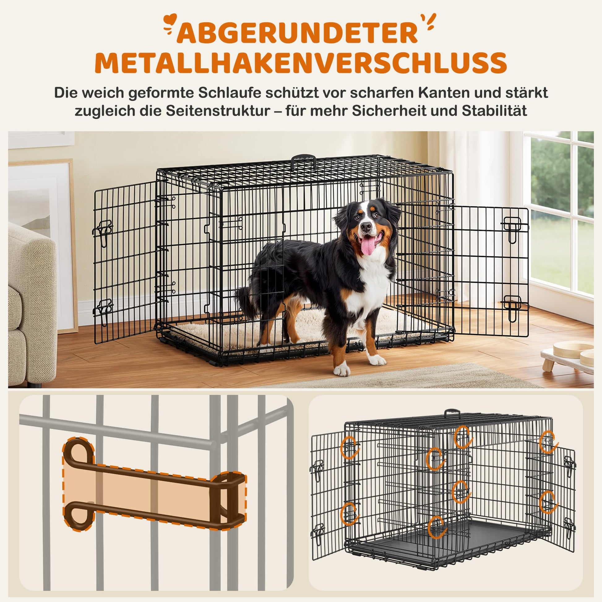 Der Käfig bietet hohe Sicherheit. Er verfügt über zwei grosse Türen für flexiblen Zugang, die jeweils mit zwei L-förmigen Sicherheitsriegeln ausgestattet sind. Diese verhindern zuverlässig, dass Ihr Hund die Türen von innen ungewollt öffnen kann.