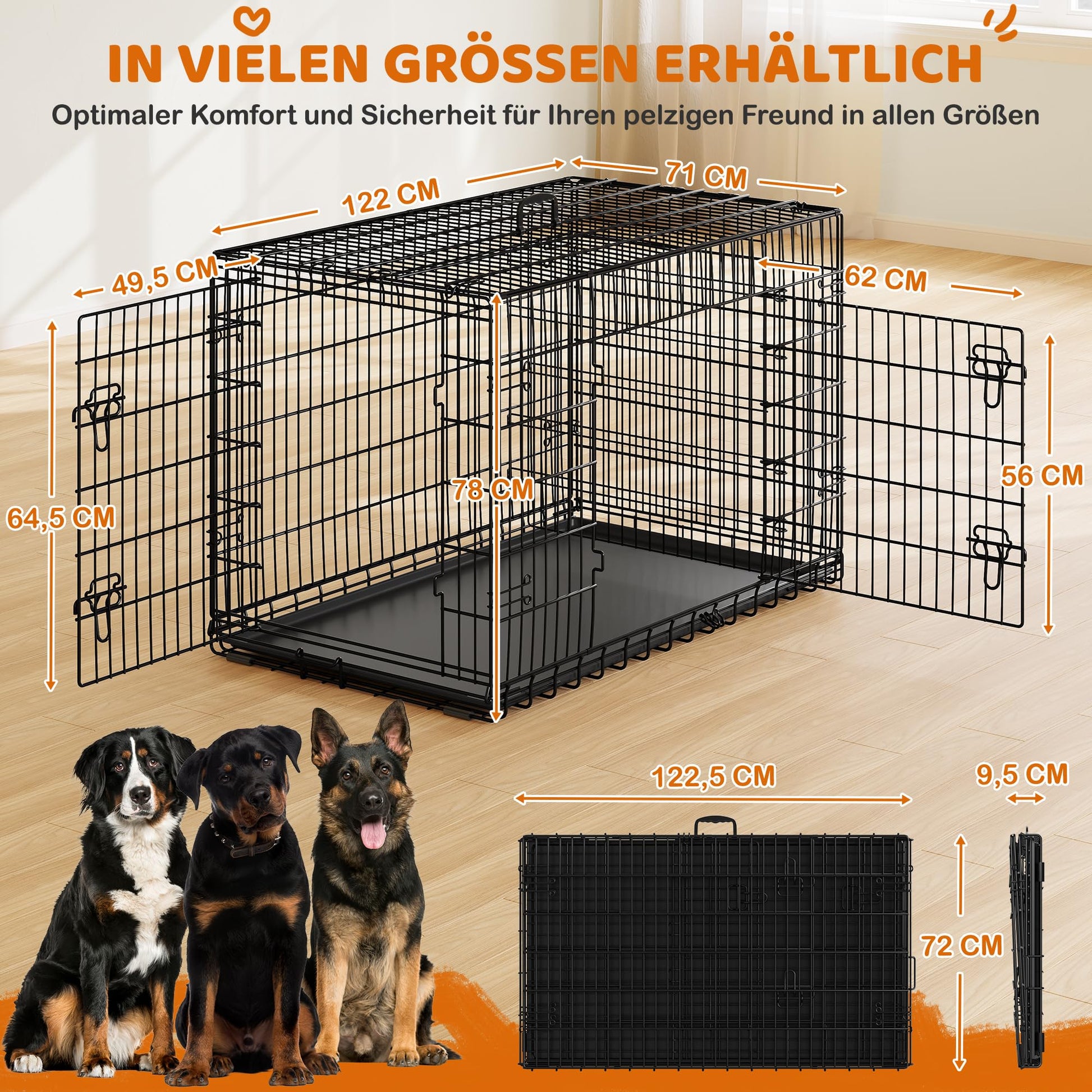 Dieser grosszügige und stabile Drahtkäfig ist die ideale Lösung für die komfortable Unterbringung und den sicheren Transport Ihres grossen Hundes. Er kombiniert robuste Bauweise mit durchdachter Funktionalität für den Alltag, das Training und Reisen.