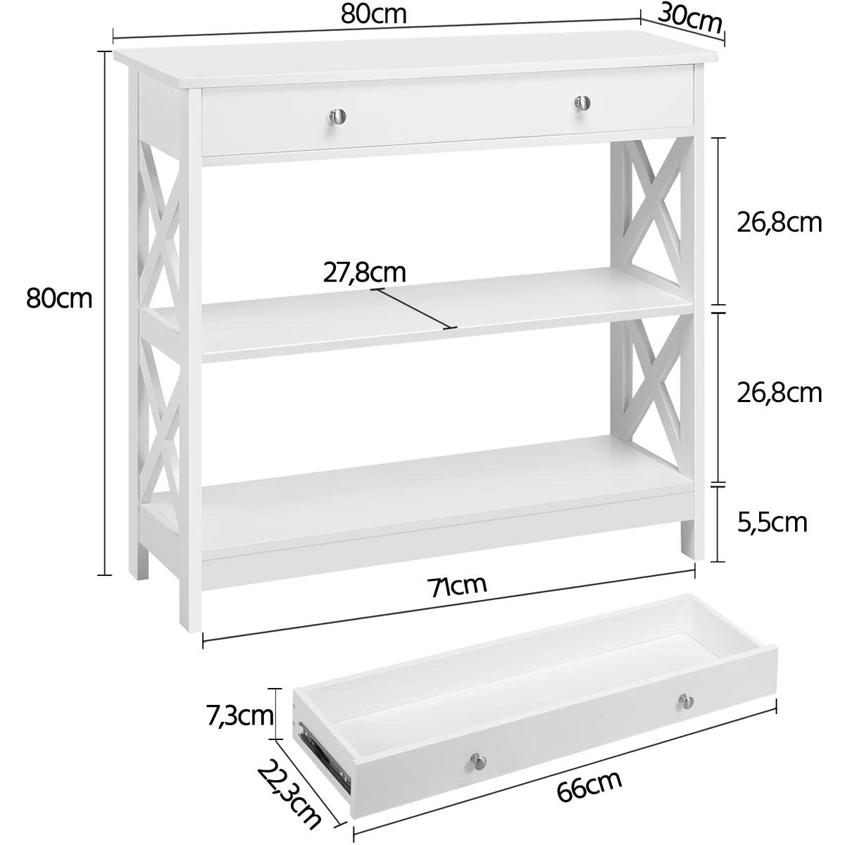 Der Tisch misst 80 cm in der Breite, 30 cm in der Tiefe und 80 cm in der Höhe. Er bietet durchdachten Stauraum mit einer grosszügigen Schublade für Kleinigkeiten und zwei zusätzlichen Ablageflächen für Dekoration, Bücher oder Körbe.