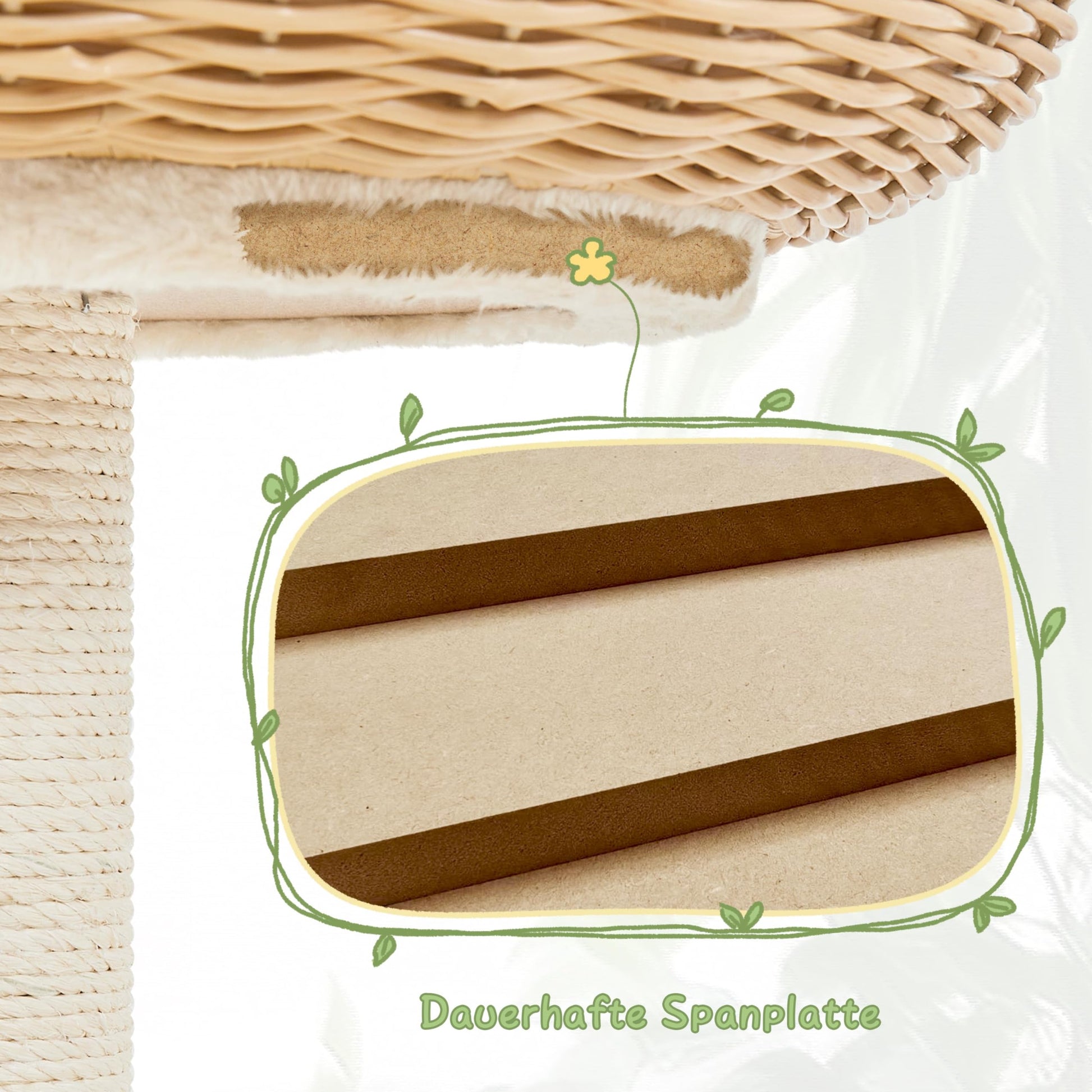 Dieser Kratzbaum ist ein Alleskönner: Er bietet einen widerstandsfähigen Sisal-Stamm zur Krallenpflege, einen animierenden Plüschball zum Spielen sowie zwei gemütliche Rückzugsorte – eine obere Liegemulde und einen kuscheligen Katzenkorb, beide mit weichen Plüschmatten ausgestattet.