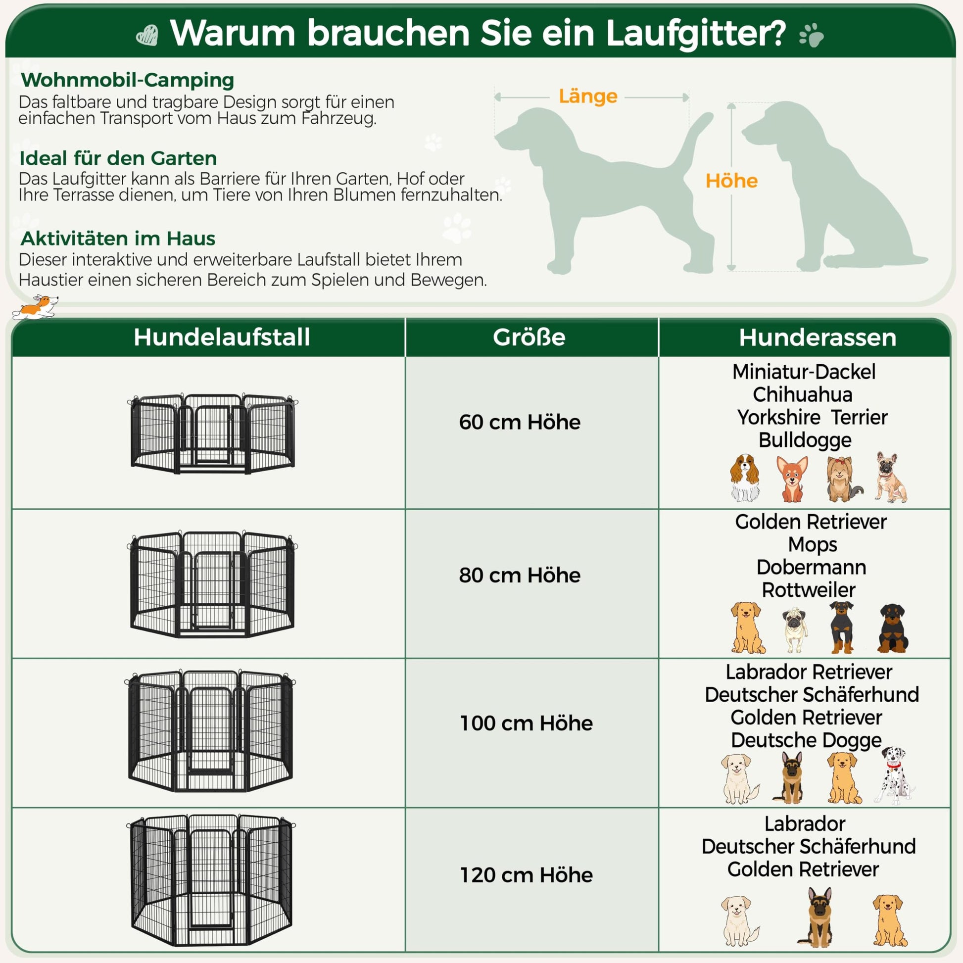 Mit seiner Höhe von 100 cm ist der Auslauf ideal für Welpen und andere klein- bis mittelgrosse Haustiere. Er eignet sich perfekt für Rassen wie Corgis, aber auch für Kaninchen oder Enten, denen er einen sicheren Bereich zum Spielen bietet.