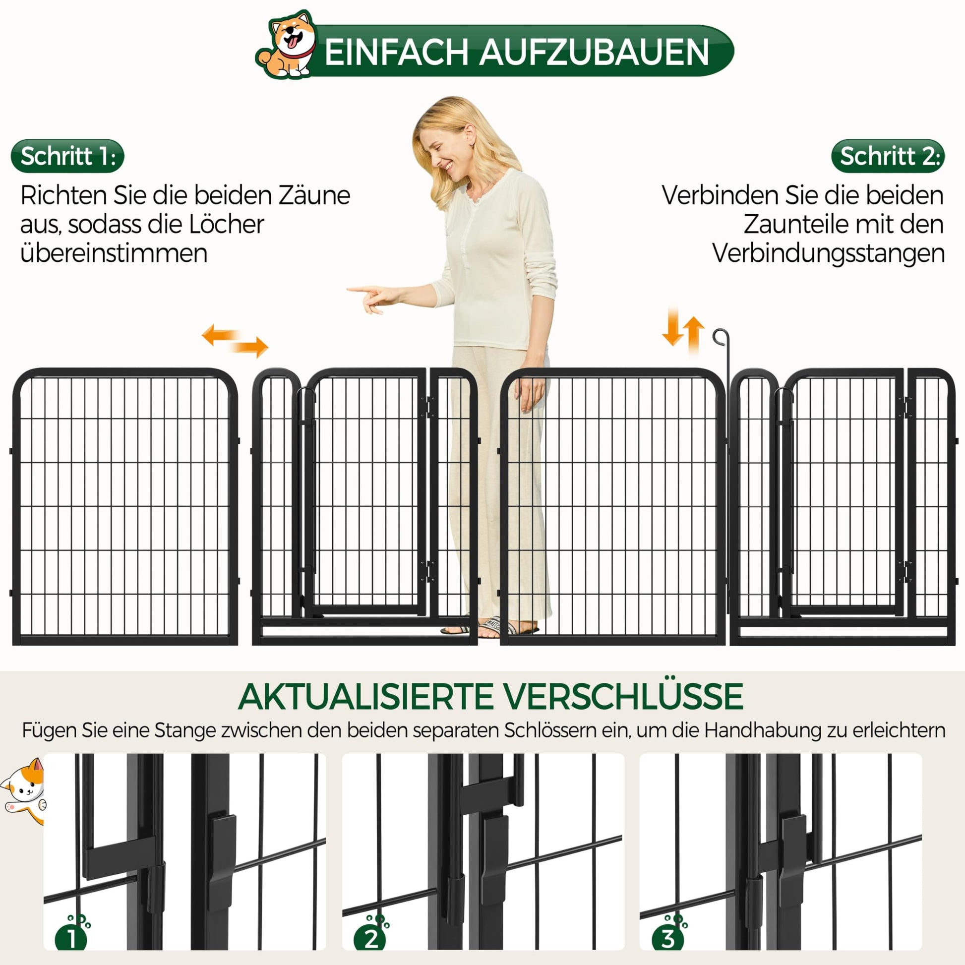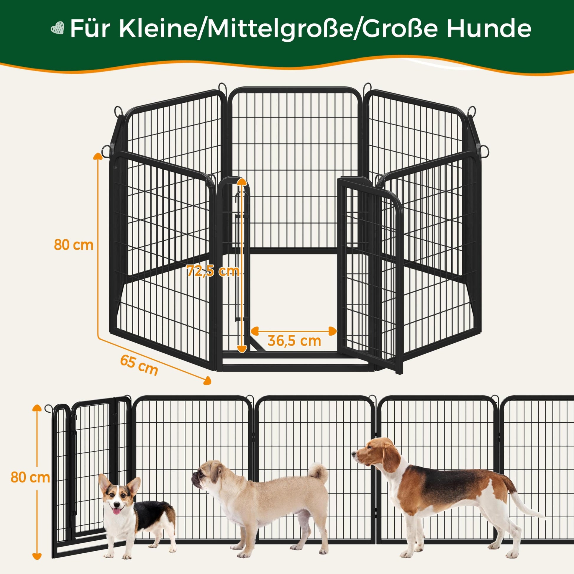 Die Höhe von 80 cm ist ideal für Welpen, kleine bis mittelgrosse Hunde, Katzen oder Kaninchen, um ein Überspringen zu verhindern. Zudem ist das Gehege modular: Sie können problemlos mehrere Sets miteinander verbinden, um die Fläche zu vergrössern.