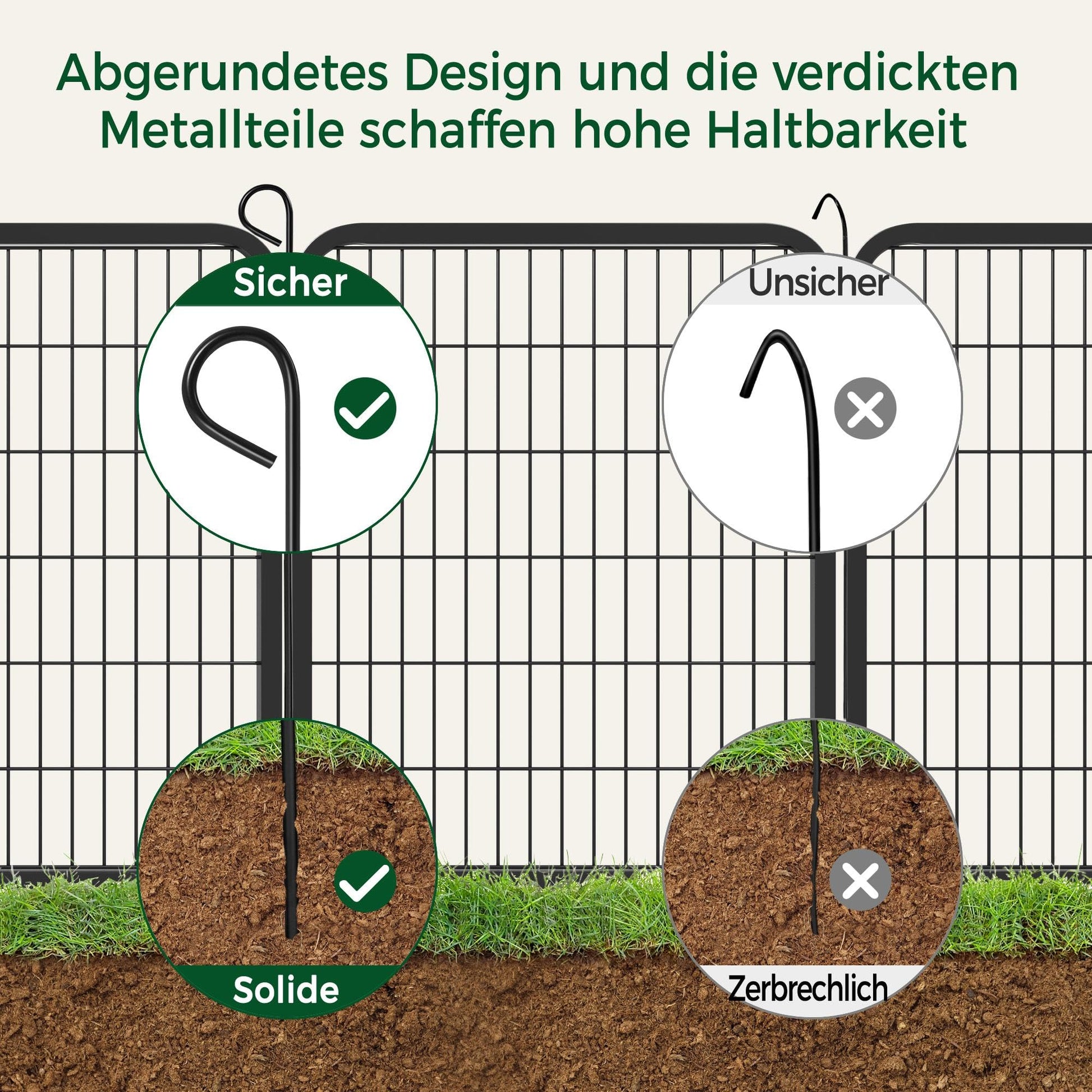 - Faltbares 8-teiliges Set: Besteht aus acht Gitterelementen, wovon eines eine integrierte Türe hat, sowie acht Bodenheringen zur Verankerung im Freien.