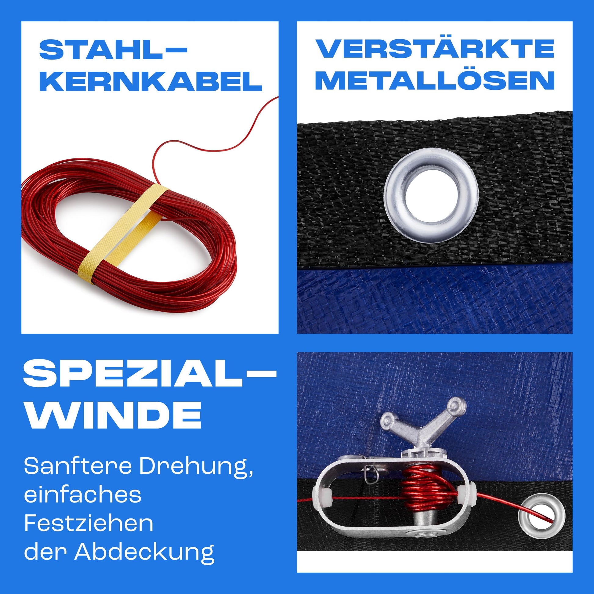 - Befestigung: Verstärkte Metallösen, Stahlseil und Ratschenverschluss